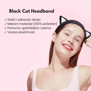 Mekana traka za kosu sa dizajnom crne mačke koja drži kosu podalje od lica tokom nege kože ili šminkanja, pružajući udobnost i zabavan izgled.