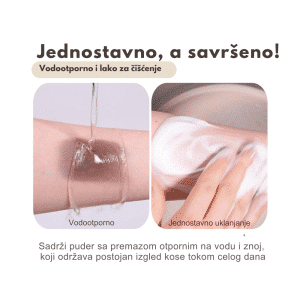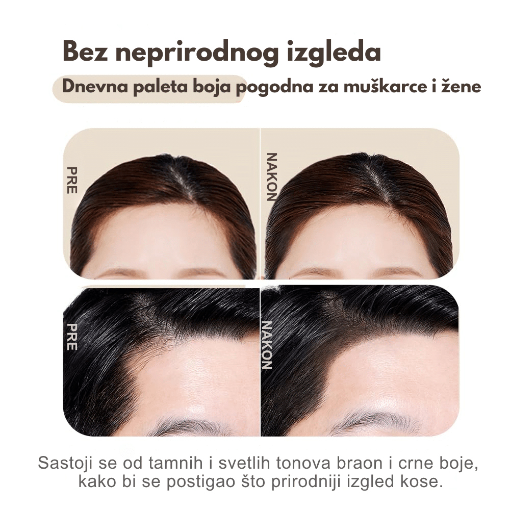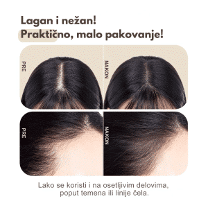 Sunđerastim aplikatorom utapkajte malu količinu proizvoda na područja gde želite popuniti i vizuelno zgušnjavati kosu — duž linije čela, razdeljka ili proređenih zona. Za prirodan prelaz nežno utapkajte ivice i po potrebi postepeno nadogradite slojeve. Nakon nanošenja, možete lagano pročešljati kosu kako bi se sve ujednačilo.