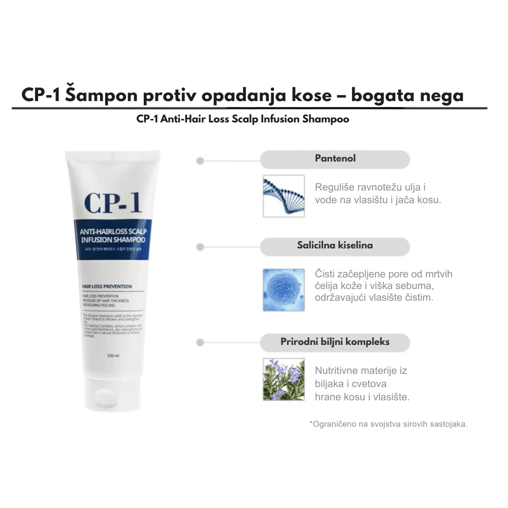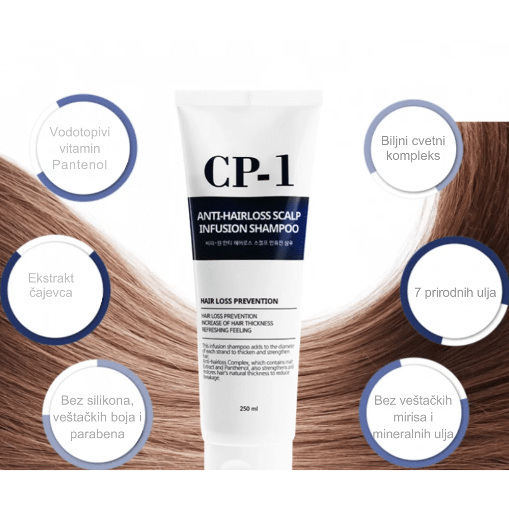CP-1 Anti Hairloss Scalp Infusion Shampoo 250ml je funkcionalni šampon za negu vlasišta formulisan za jačanje korena kose i smanjenje opadanja. Nežno čisti kosu i kožu glave, uklanja višak sebuma i nečistoće, dok istovremeno pomaže u održavanju zdrave ravnoteže vlasišta. Obogaćen aktivnim sastojcima koji doprinose jačanju kose, ostavlja osećaj svežine, čistoće i lagane hidratacije bez isušivanja.