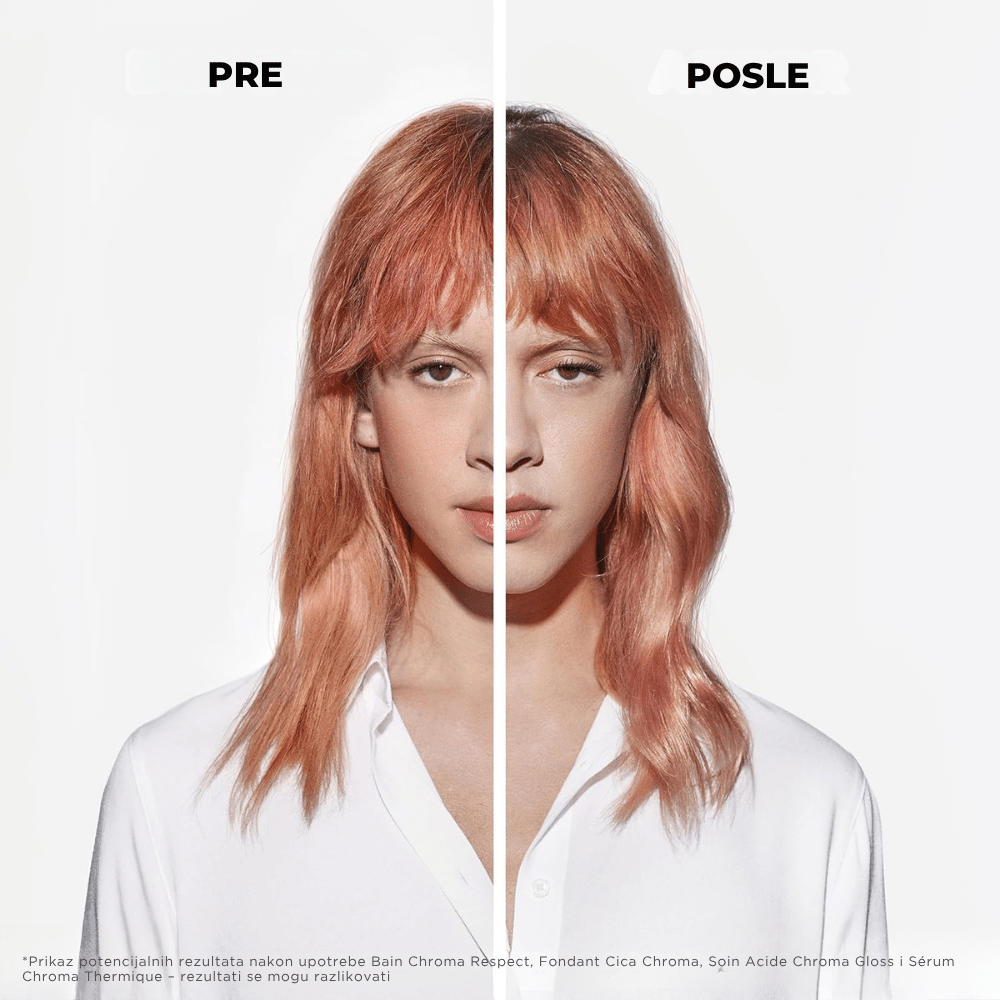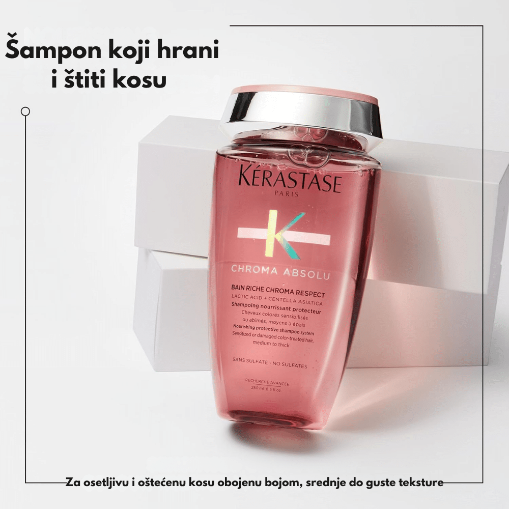 Kérastase Chroma Absolu Bain Riche Chroma Respect je hranljiv šampon bez sulfata namenjen bojenoj kosi srednje do gušće teksture, posebno ako je osetljiva, suvlja ili sklona oštećenjima.