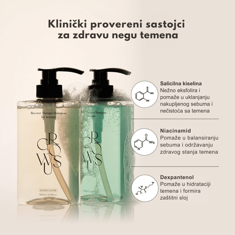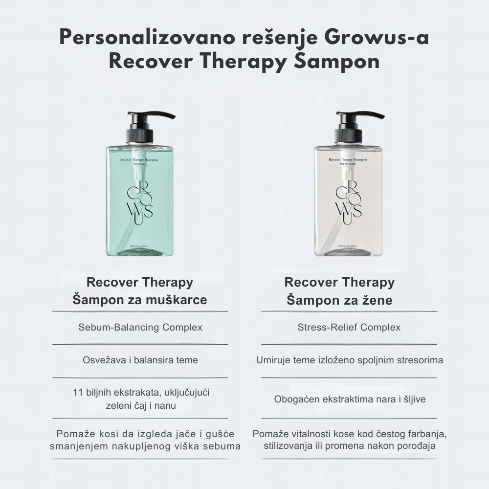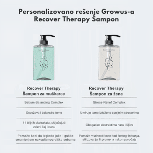 Growus Recover Therapy Shampoo for Man 500ml je terapijski šampon posebno formulisan za potrebe muškog vlasišta, sa fokusom na jačanje kose i održavanje zdrave ravnoteže kože glave. Nežno, ali temeljno čisti kosu i vlasište, pomaže u uklanjanju viška sebuma i nečistoća, dok istovremeno doprinosi osećaju svežine i komfora. Redovnom upotrebom kosa ostaje čista, uredna i jača, bez isušivanja i otežavanja.