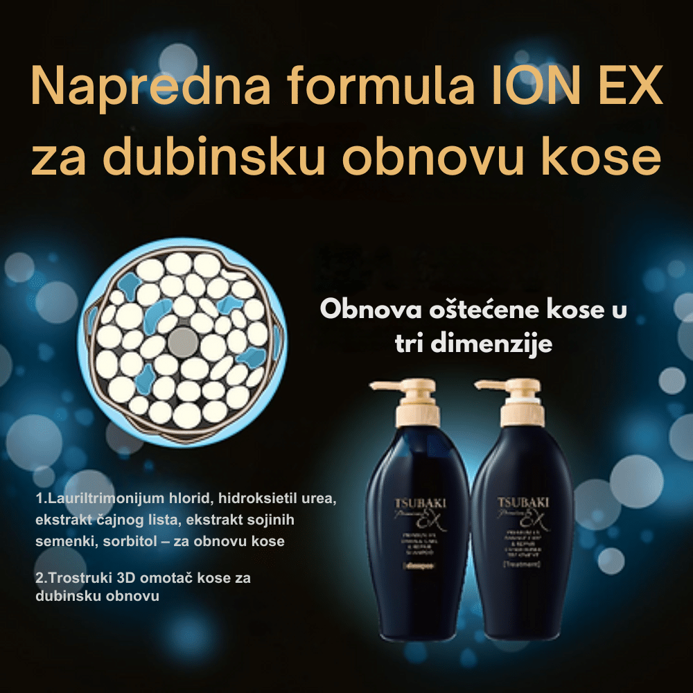 Shiseido Tsubaki Premium EX Damage Care & Repair Shampoo 450 ml je luksuzni šampon za oštećenu kosu koji dubinski hrani, obnavlja i jača vlakna koristeći Ion EX tehnologiju i ulje kamelije (Tsubaki). Formula intenzivno obnavlja oštećene delove kose, povećava elastičnost, smanjuje lomljenje i daje izuzetnu mekoću, sjaj i volumen — idealan je za kosu iscrpljenu hemijskim tretmanima, toplotnim stilizovanjem ili suvim krajevima.