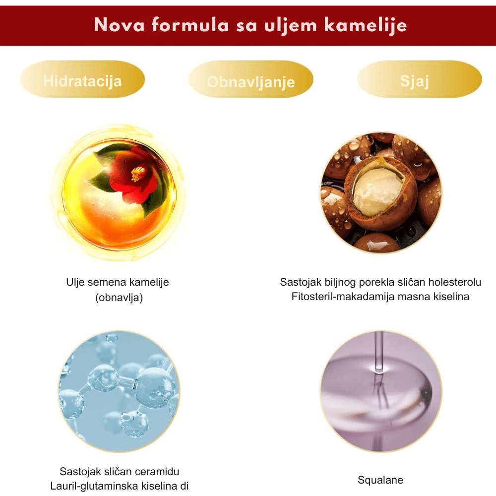 Šampon sa uljem kamelije koji jača tanku i oštećenu kosu, vraća volumen, sjaj i elastičnost, ostavljajući kosu glatkom, laganom i punom života.
