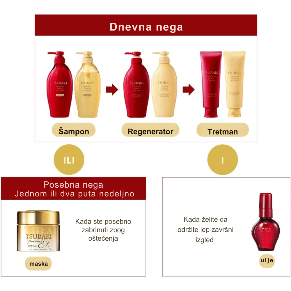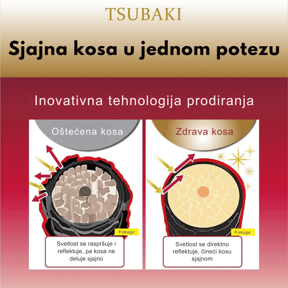 Nanesite na mokru kosu i vlasište, umasirajte blagim pokretima 1–2 minuta kako bi formula aktivno delovala, a zatim dobro isperite. Preporučuje se nastavak nege sa Tsubaki maskom ili balzamom. Izbegavati kontakt sa očima; u slučaju kontakta temeljno isprati vodom. Čuvati van domašaja dece.