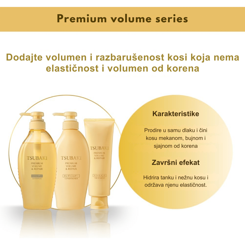 Shiseido Tsubaki Premium Volume & Repair Shampoo je visokokvalitetan japanski šampon koji obnavlja oštećenu, tanku i beživotnu kosu, vraćajući joj punoću, sjaj i elastičnost. Zahvaljujući ulju kamelije (tsubaki), proteinima i negujućim hidratantnim komponentama, ovaj šampon čisti temeljno, ali nežno, jača vlas iznutra i poboljšava njenu strukturu nakon svakog pranja.