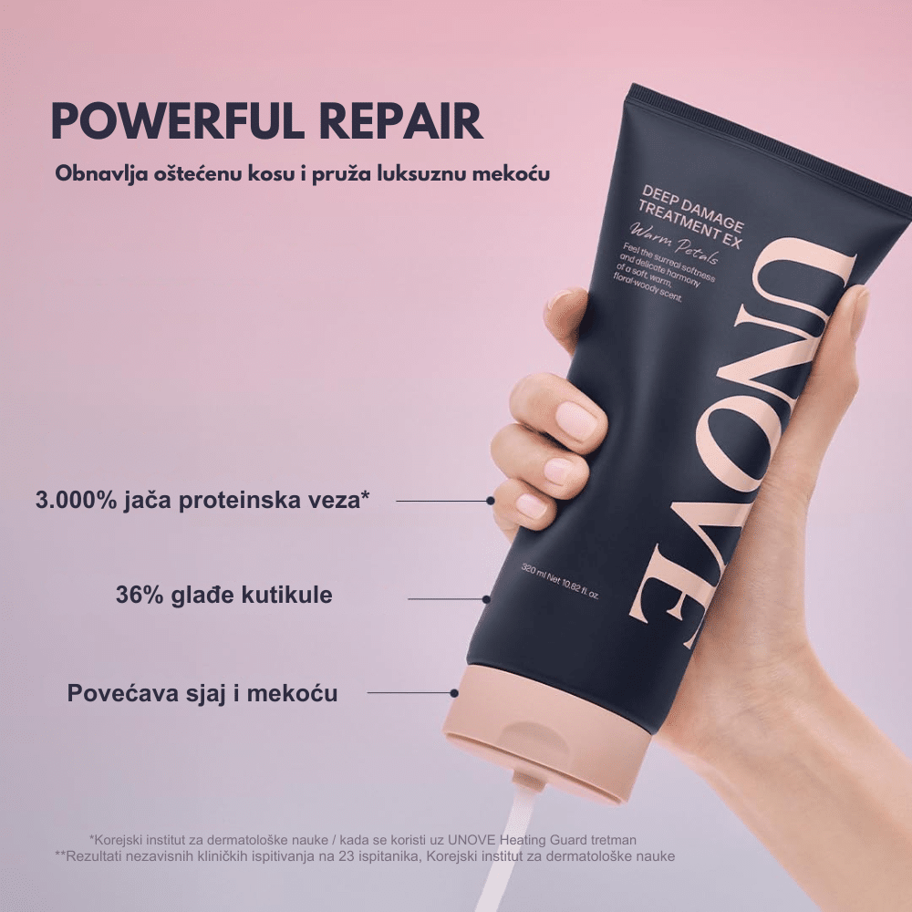 UNOVE Deep Damage Treatment EX (Tender Bloom) je intenzivna maska za oštećenu i suvu kosu, bogata keratinom i biljnim uljima, koja obnavlja strukturu vlasi, smanjuje krhkost i ispucale vrhove, dok istovremeno čini kosu mekom, sjajnom i lakom za raščešljavanje.