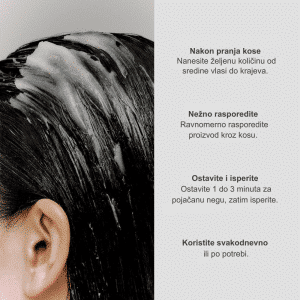 Nanesite odgovarajuću količinu na čistu, vlažnu kosu nakon šampona, fokusirajući se na sredinu i vrhove kose. Nežno umasirajte, ostavite da deluje 1–3 minuta, pa temeljno isperite toplom vodom. Za intenzivniju regeneraciju, možete ostaviti 5–10 minuta.
