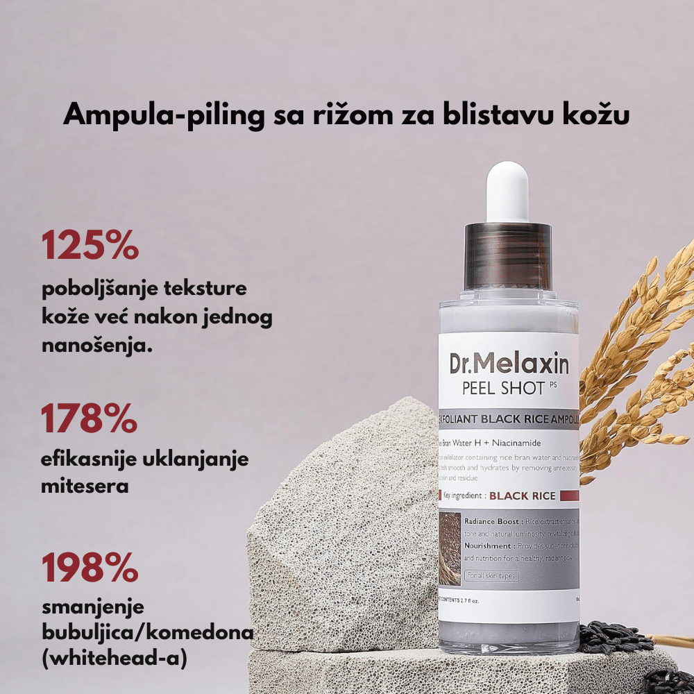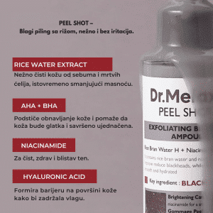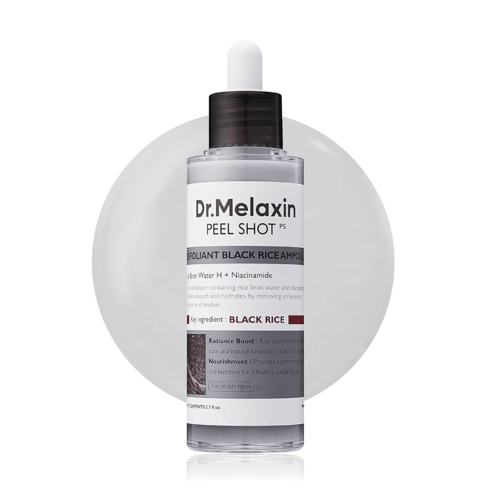 Dr.Melaxin Peel Shot Exfoliant Black Rice Ampoule je intenzivni piling-serum za lice koji kombinuje moćni „PentaRice“ kompleks (uz vodu od crnog pirinča), AHA/BHA/PHA kiseline i niacinamid kako bi nežno uklonio mrtve ćelije, pročistio pore, kontrolisao sebum i vratio blistav ten bez osećaja iritacije.