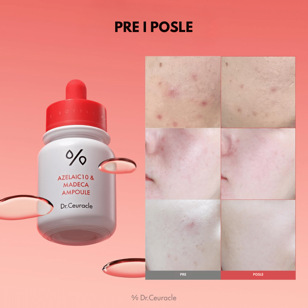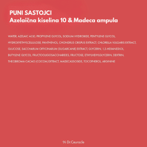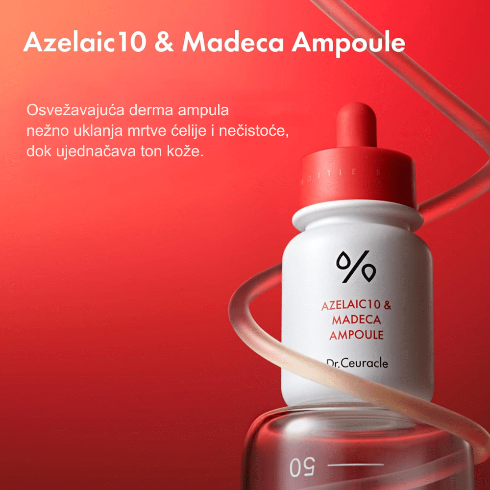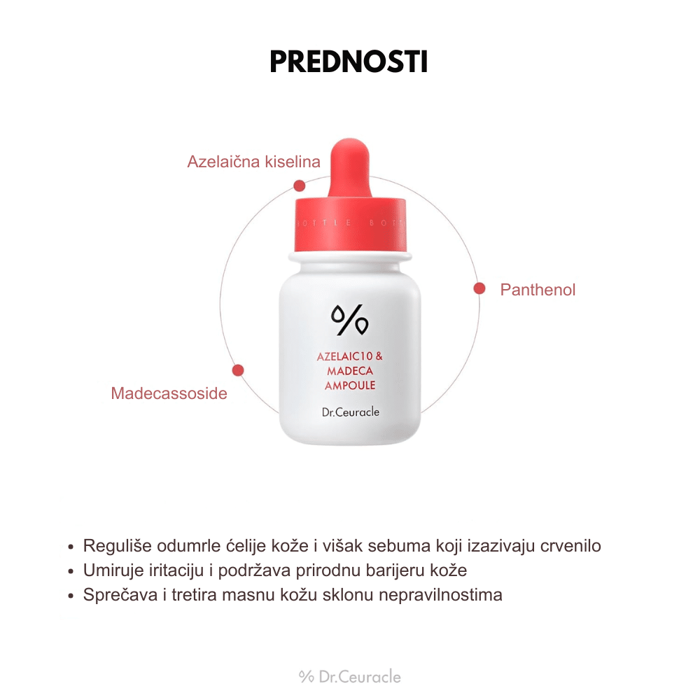 Dr.Ceuracle Azelaic10 & Madeca Ampoule je koncentrovana ampula formulisana za umirivanje problematične i osetljive kože, smanjenje crvenila i ujednačavanje tena. Kombinacija azelaične kiseline i Madecassoside pomaže u balansiranju kože sklone aknama, jačanju kožne barijere i poboljšanju teksture kože bez iritacije.