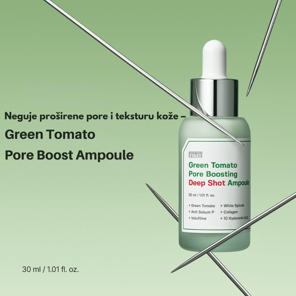 Sungboon Editor Green Tomato Pore Boosting Deep Shot Ampoule je ciljano formulisana ampula koja pomaže u sužavanju pora i ujednačavanju teksture kože.