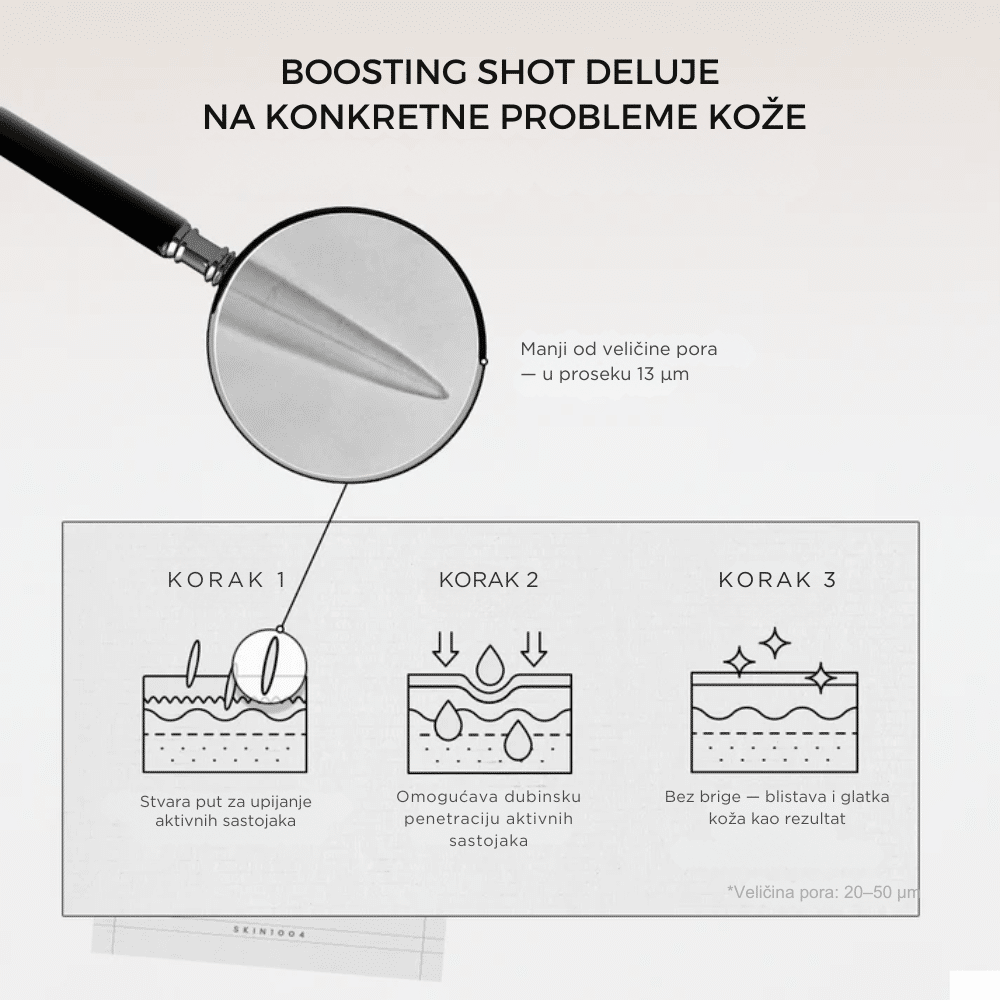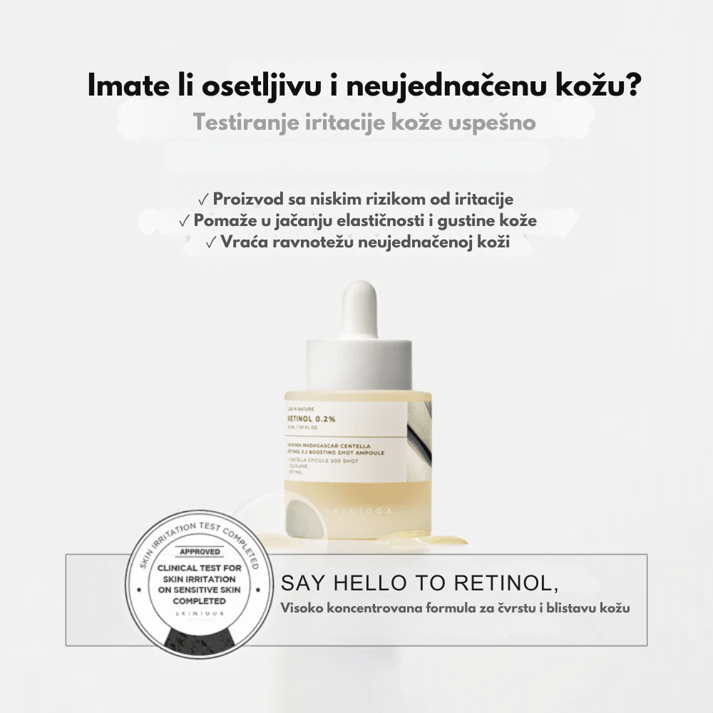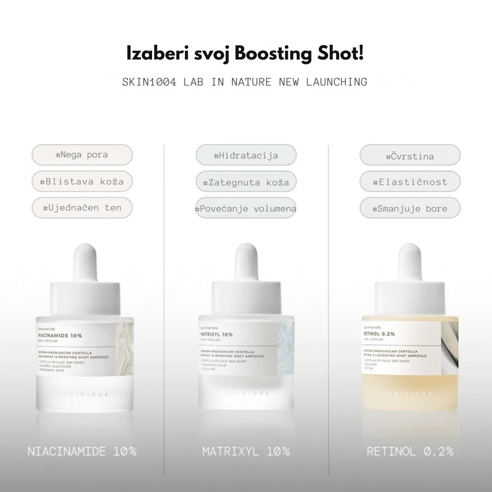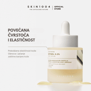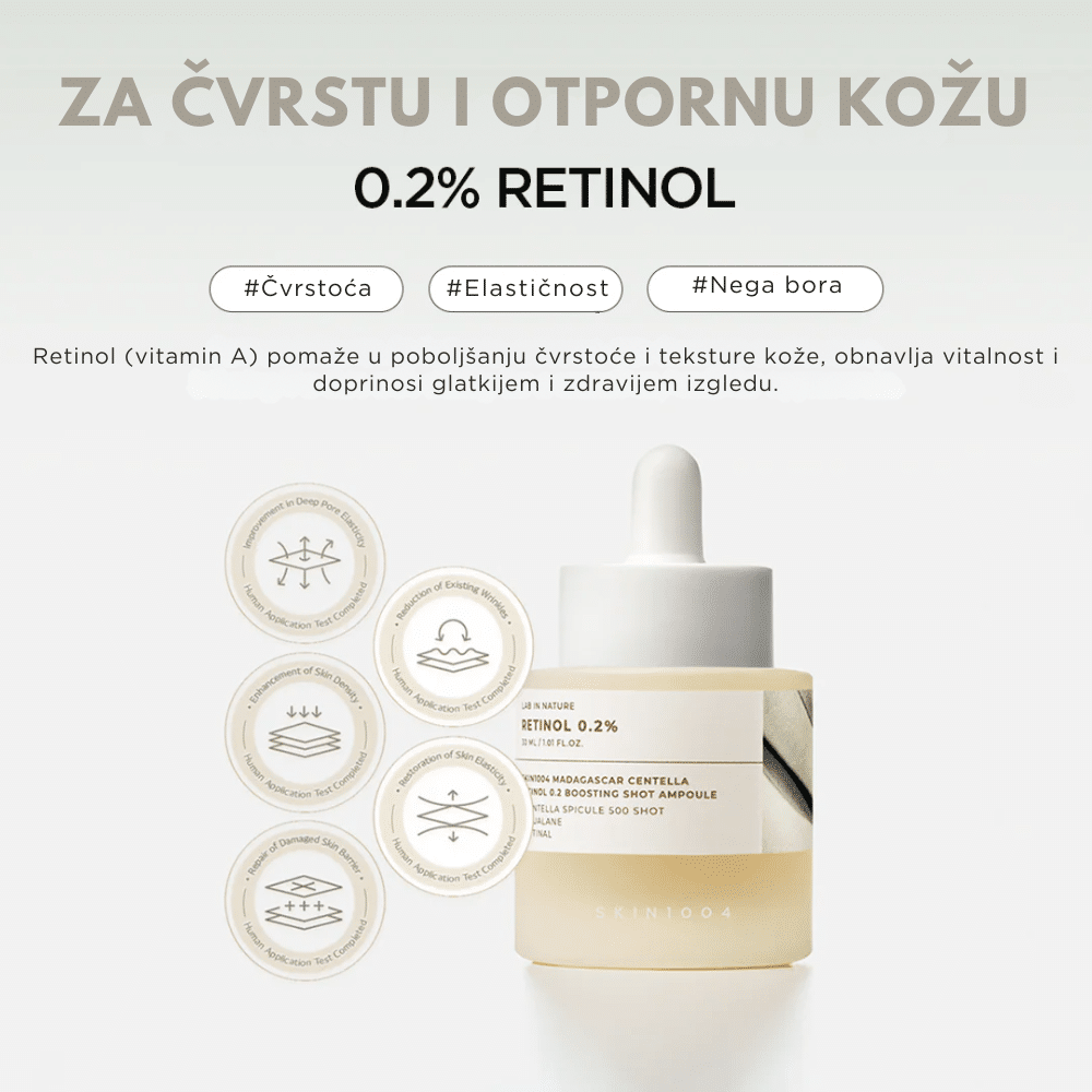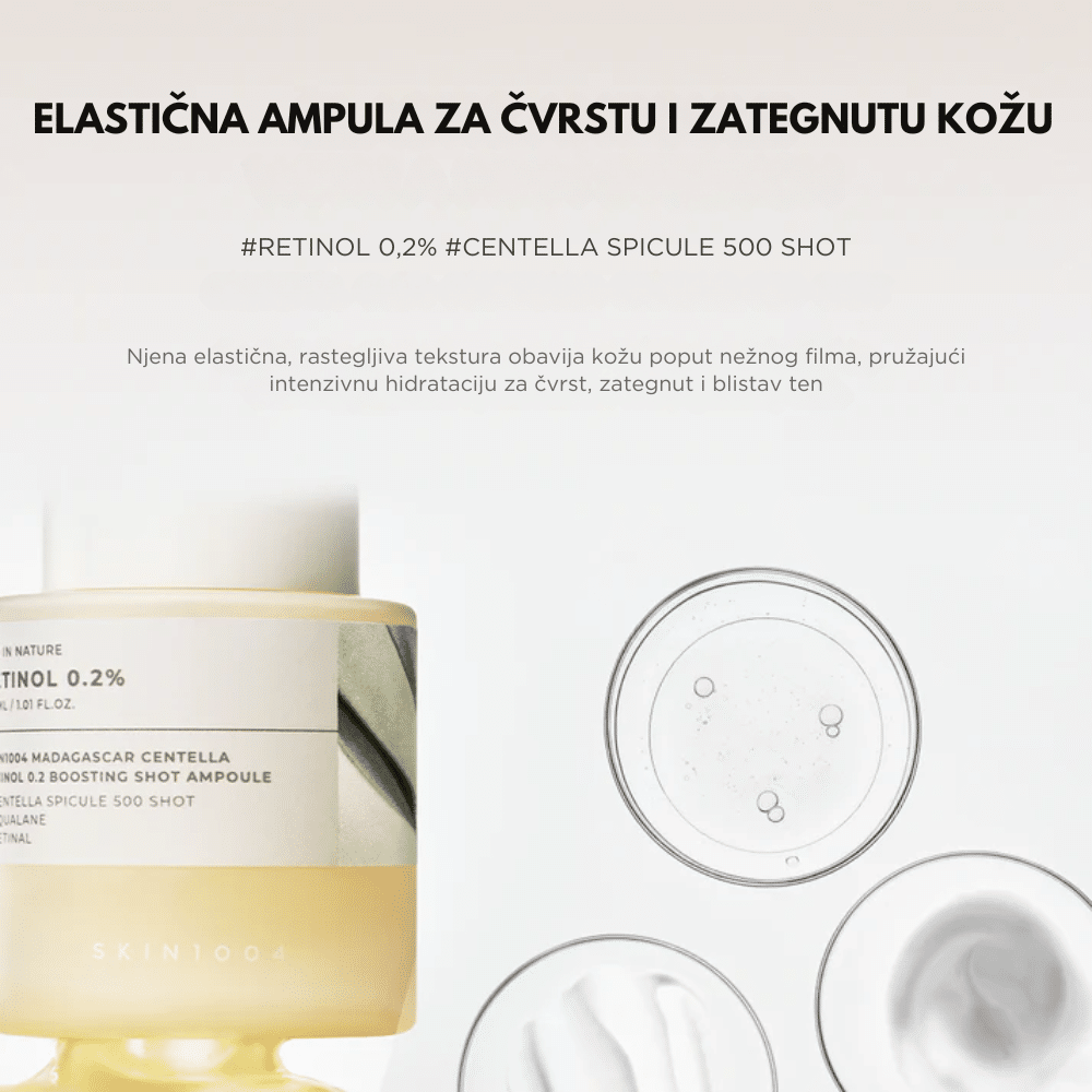 SKIN1004 Retinol 0.2 Boosting Shot Ampoule je napredna anti‑aging formula koja kombinuje 0,2 % retinola, retinal, squalane, bogat ekstrakt Centella Asiatica iz Madagaskara i panthenol, isporučujući aktivne sastojke duboko u kožu zahvaljujući mikropisku (spiculi) strukturi. Ovaj inovativni hibrid serum/fluid stimuliše sintezu kolagena, zaglađuje teksturu, jača barijeru kože, smanjuje fine linije i bore, istovremeno umirujući i hidrirajući kožu. Rezultati se vide već nakon prve upotrebe — elasticitet se poboljšava za 132,8 %, a pora za čvršću strukturu, sa vidljivim efektima nakon dve nedelje kliničkih testiranja