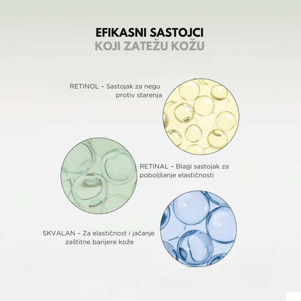 Mikro‑spicule hibrid serum sa retinolom, retinalom i centellom za zatezanje, zaglađivanje i hidrataciju kože s minimalnom iritacijom.