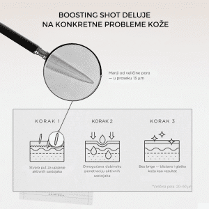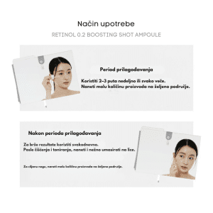 Nakon temeljitog čišćenja i toniranja, nanesite malu količinu ampule na suvu kožu, pažljivo tapkajući dok se mikro‑spiculi rastvore i serum potpuno upije. Počnite sa 2–3 puta nedeljno kako biste prilagodili kožu retinolu, a nakon toga možete koristiti svaki dan, uveče. Završite niacinamidom ili hidratantnom kremom, a tokom dana je obavezna zaštita SPF kremom. U slučaju peckanja ili preterane iritacije, smanjite učestalost upotrebe.