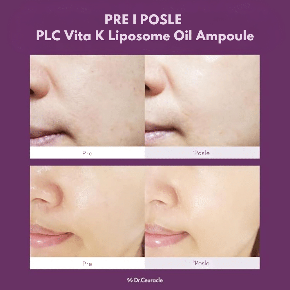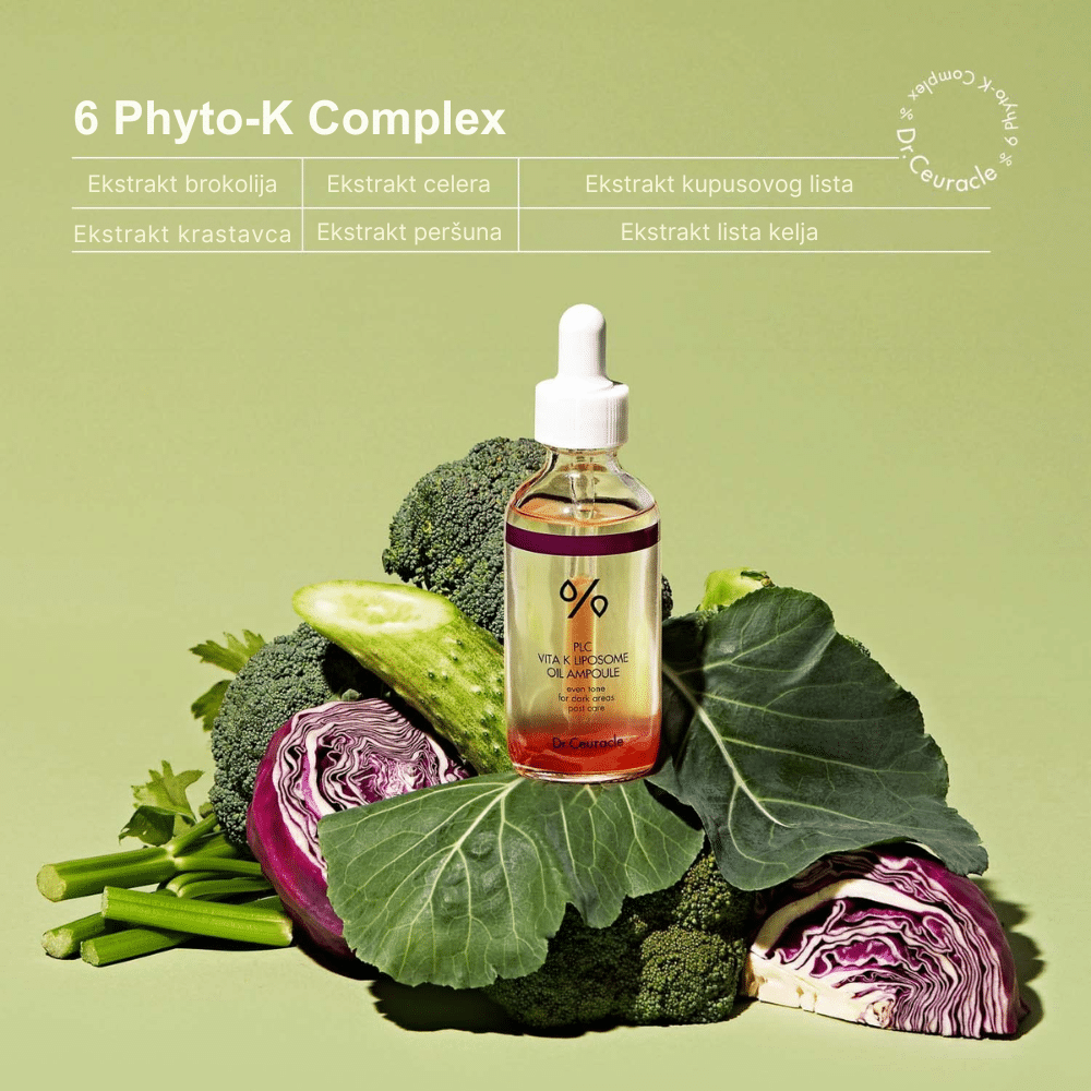 Dr.Ceuracle PLC Vita Liposome Oil Ampoule 50ml je lagani serum sa vitaminom K, formulisan za ujednačavanje tona kože i smanjenje nepravilnosti poput modrica i tamnih krugova. Sadrži 6 Green Vegetable Complex, koji uključuje ekstrakte brokolija, kelja, krastavca, celera, kupusnog lista i peršuna, bogate prirodnim vitaminom K. Ovaj serum poboljšava mikrocirkulaciju, ujednačava ten i prosvetljuje ga, dok dvostruka formula seruma pruža duboku hidrataciju, ostavljajući kožu mekom i glatkom.
