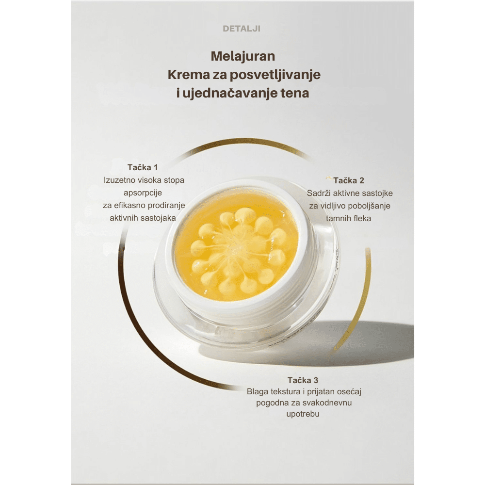 Ergonomski dizajn glave uređaja omogućava precizno tretiranje kritičnih zona (obrazi, čelo, oko usana) gde se fleke najčešće pojavljuju. Korišćenjem ovog uređaja uz Melajuran liniju proizvoda (poput ampula sa vitaminom C ili niacinamidom), apsorpcija se povećava za više od 200% u poređenju sa običnim nanošenjem prstima. Rezultat je vidno svetliji, ujednačeniji ten i lice koje zrači prirodnom blistavošću, uz značajno smanjenje vidljivosti sunčevih pega i post-akni mrlja.
