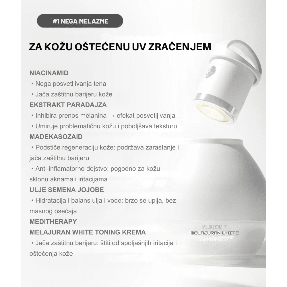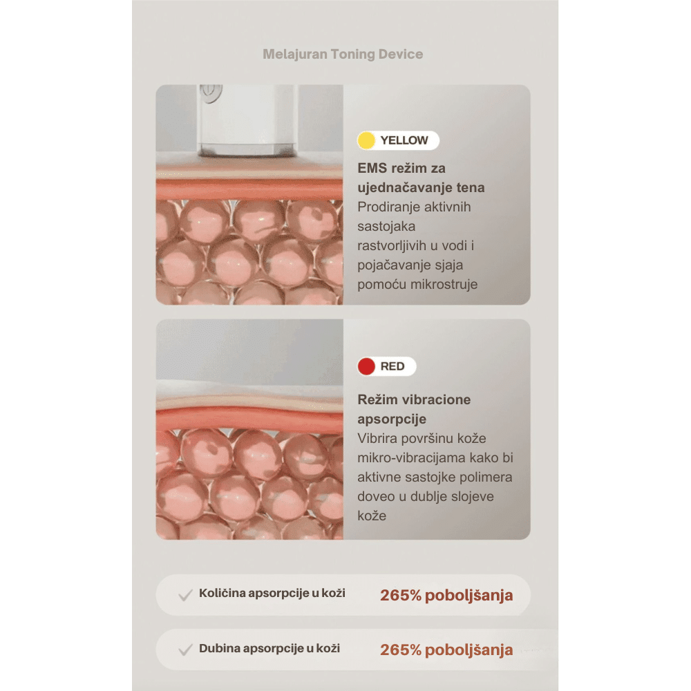 MEDITHERAPY Melajuran Toning Device predstavlja sledeću generaciju kućnih kozmetičkih uređaja, specifično dizajniranih za borbu protiv uporne hiperpigmentacije, tamnih fleka i beživotnog tena. Ovaj uređaj koristi naprednu EMS (električnu mišićnu stimulaciju) u kombinaciji sa belom i crvenom LED svetlošću i blagim vibracijama kako bi aktivne sastojke iz seruma i krema “ugurao” duboko u dermis. Njegova primarna funkcija je da ubrza razgradnju melanina i stimuliše mikrocirkulaciju, čime se postiže efekat profesionalnog “toning” tretmana u udobnosti doma.