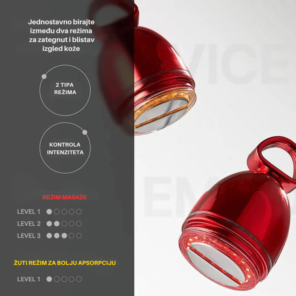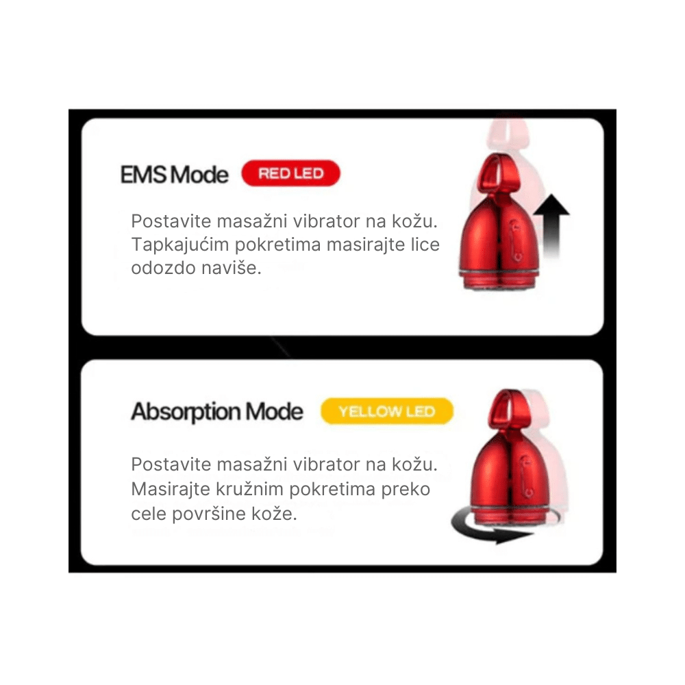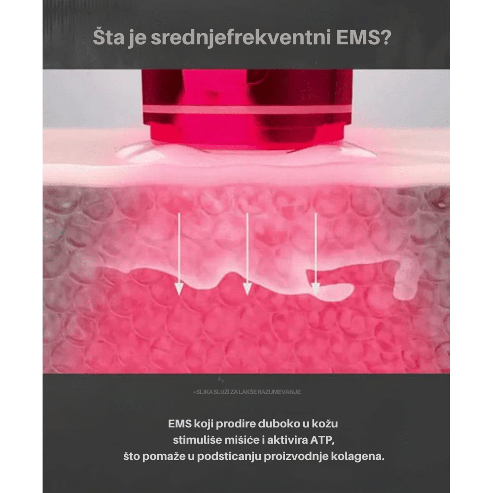 Unapređeni EMS uređaj za lifting i zatezanje lica. Povećava apsorpciju zlatnih niti, stimuliše mišiće i redefiniše konture za vidno podmlađen izgled.