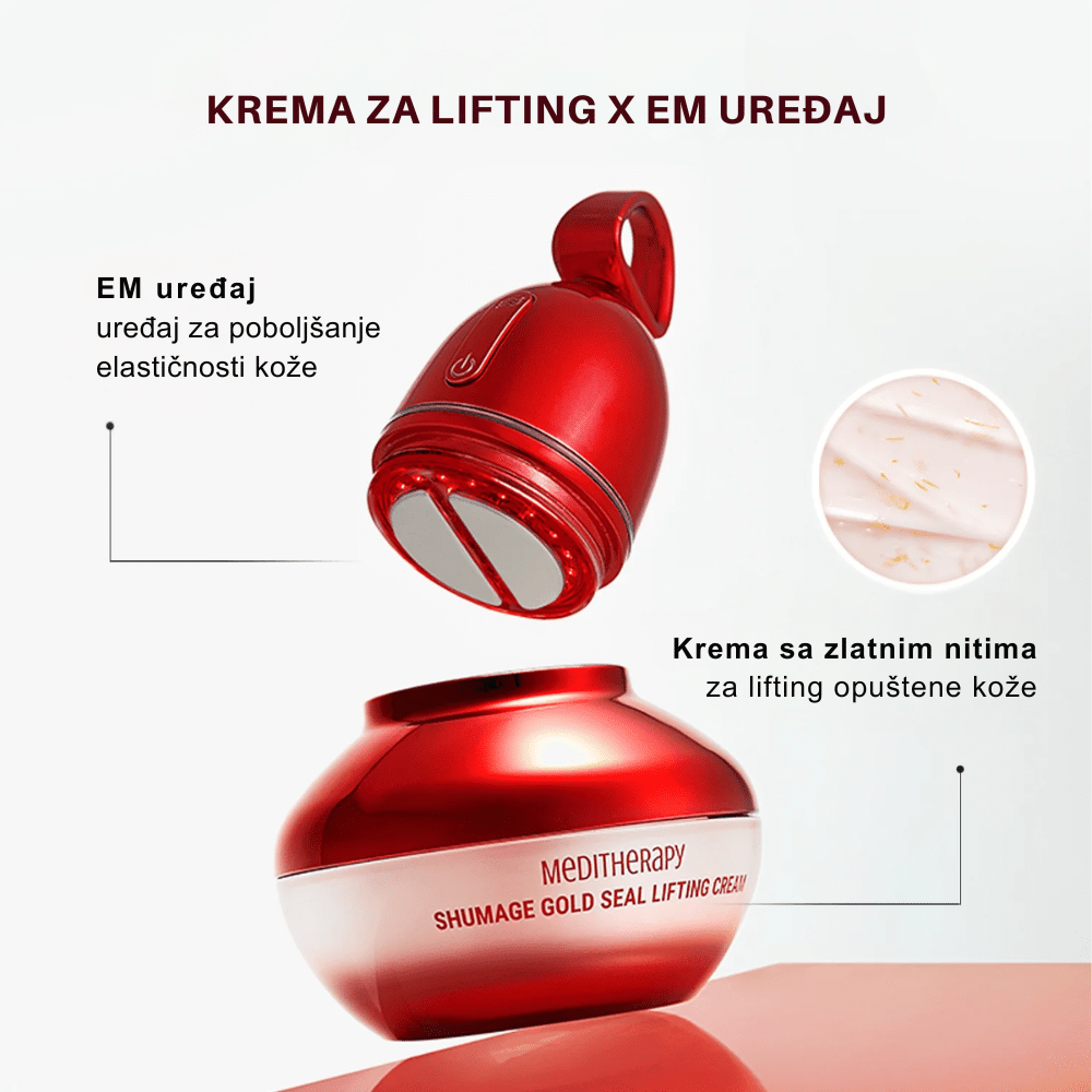 MEDITHERAPY Shumage EMS Device (2025 Version) predstavlja najnoviju generaciju kućnih lifting uređaja, specijalno optimizovanu za rad sa Shumage Gold Seal linijom. Ova unapređena verzija donosi precizniju kontrolu EMS (električne mišićne stimulacije) i poboljšanu LED terapiju kako bi se maksimizovao efekat “topljenja” zlatnih niti i njihova apsorpcija duboko u dermis. Uređaj je dizajniran da oponaša profesionalne tretmane zatezanja lica, ciljajući specifične mišiće koji sa godinama gube tonus, uzrokujući opuštanje obraza i linije vilice.