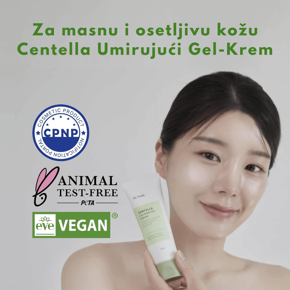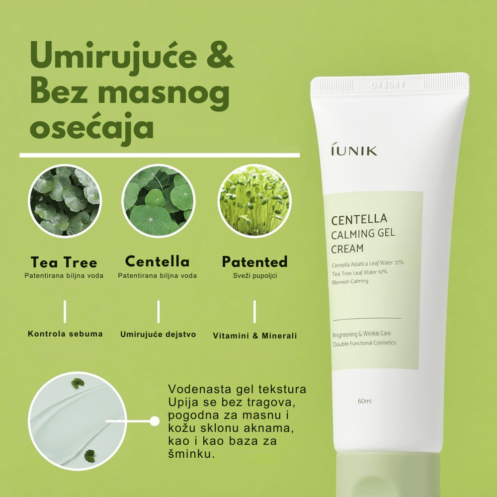 iUNIK Centella Calming Gel Cream je lagana gel-krema sa 72% Centella Asiatica Leaf Water i 10% Tea Tree Leaf Water, kreirana da umiri iritiranu, masnu i kombinovanu kožu, pruži hidrataciju bez težine i ojača zaštitnu barijeru.