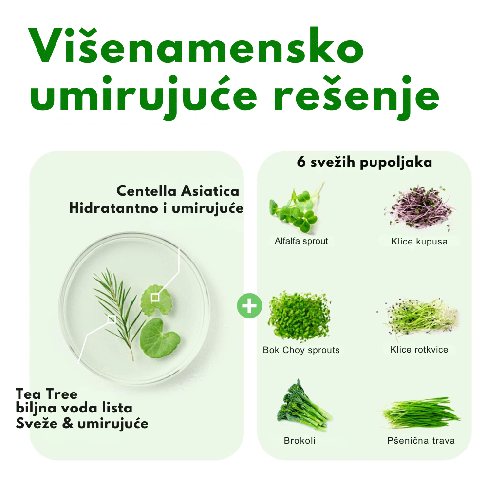 Centella Asiatica Leaf Water, Melaleuca Alternifolia (Tea Tree) Leaf Water, Butylene Glycol, Water, Niacinamide, Methyl Trimethicone, Acrylates/C10-30 Alkyl Acrylate Crosspolymer, Arginine, 1,2-Hexanediol, Caprylyl Glycol, Dimethicone, Dimethicone/Vinyl Dimethicone Crosspolymer, Centella Asiatica Extract, Allantoin, Melaleuca Alternifolia (Tea Tree) Leaf Extract, Ethylhexylglycerin, Adenosine, Dipotassium Glycyrrhizate, Citrus Aurantium Bergamia (Bergamot) Fruit Oil, Pentylene Glycol, Sodium Hyaluronate, Medicago Sativa (Alfalfa) Extract, Brassica Oleracea Italica (Broccoli) Extract, Triticum Vulgare (Wheat) Germ Extract, Brassica Oleracea Capitata (Cabbage) Leaf Extract, Brassica Campestris (Rapeseed) Extract, Raphanus Sativus (Radish) Seed Extract, Yucca Schidigera Root Extract, Commiphora Myrrha Resin Extract, Perilla Frutescens Leaf Extract.