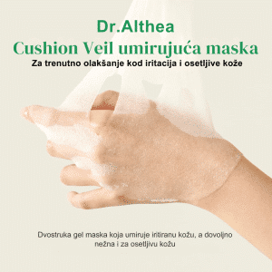 Dr.Althea Cushion Veil Calming Mask pruža intenzivnu hidrataciju i trenutno umiruje iritiranu i osetljivu kožu. Inovativna formula bogata hijaluronskom kiselinom, ceramidima i ekstraktima biljaka jača barijeru kože i vraća njen prirodan balans. Tkanina maske natopljena je laganom, ali hranljivom esencijom koja osvežava, umiruje crvenilo i čini ten ujednačenim i blistavim. Savršena je za negu nakon izlaganja suncu ili tretmana, pružajući efekat poput profesionalnog spa tretmana kod kuće.