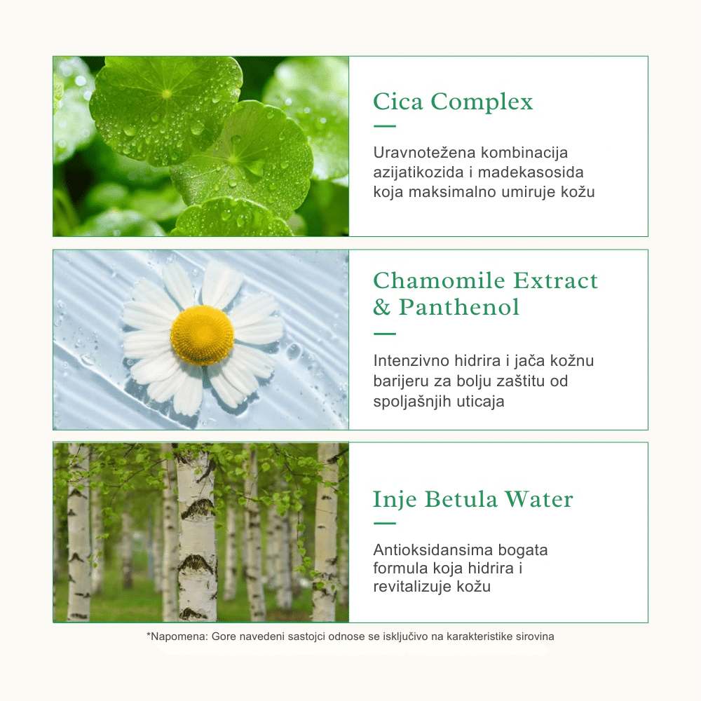 Centella Asiatica, poznata i kao "tigrova trava" i CICA, je biljka bogata umirujućim, regenerativnim i hidratantnim svojstvima, zbog čega je jedan od najcenjenijih sastojaka u kozmetici. Tradicionalno se koristi za ubrzavanje zarastanja rana i jačanje zaštitne barijere kože, a danas je posebno popularna u nezi osetljive, iritirane i problematične kože. Centella Asiatica sadrži aktivne komponente poput Madecassoside, Asiaticoside, Asiatic Acid i Madecassic Acid, koje pomažu u smanjenju crvenila, umirivanju upala i poboljšanju elastičnosti kože. Takođe je bogata antioksidansima koji štite kožu od slobodnih radikala i usporavaju proces starenja. Zbog svoje sposobnosti da hidrira, obnavlja i umiruje, često se koristi u serumima, kremama i tonerima namenjenim suvoj, osetljivoj i iritiranoj koži, ali i kod kože sklone aknama.