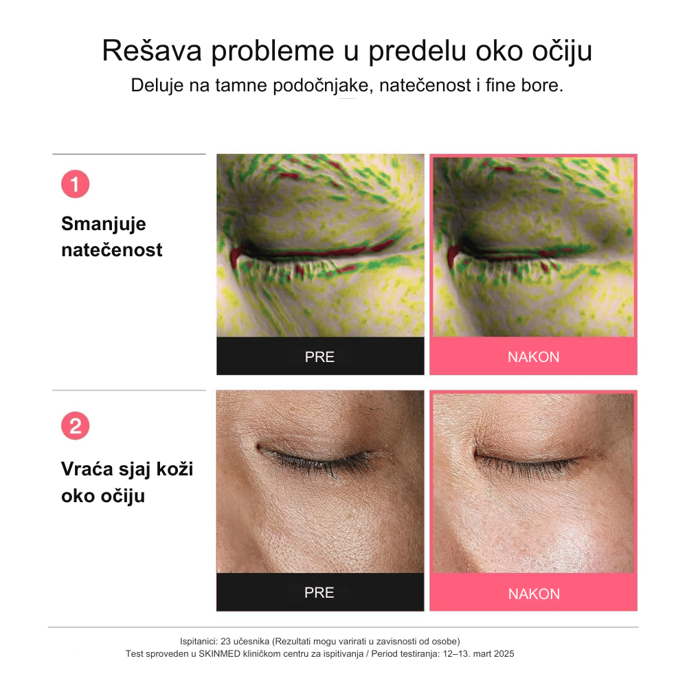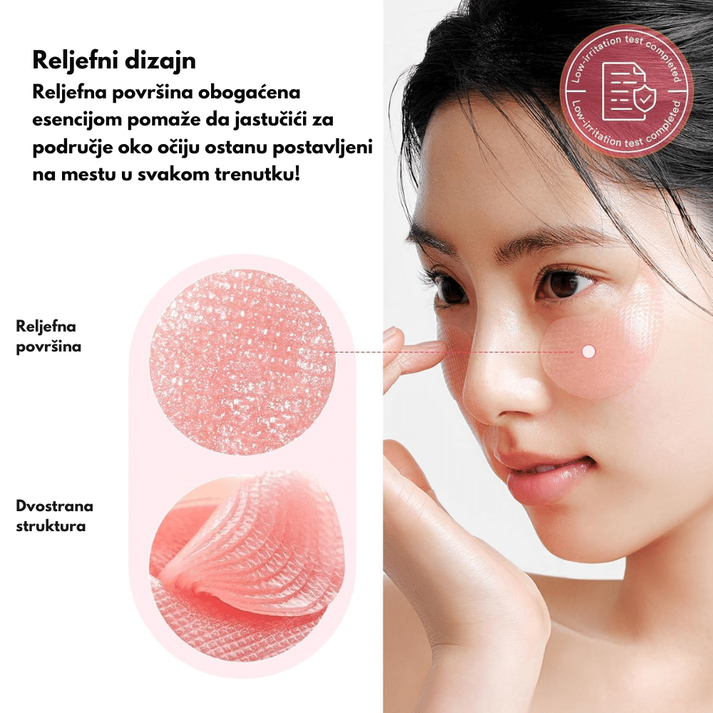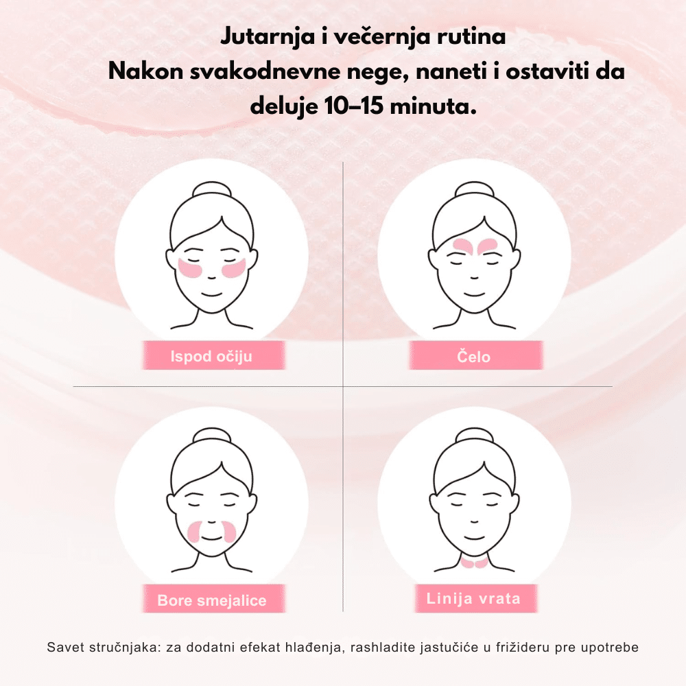 Nakon čišćenja i toniranja, pažljivo nanesite jedan flaster na područje ispod oka, tako da se dobro prione uz kožu. Ostavite 10–15 minuta, zatim uklonite flaster i nežno utapkajte preostali serum u kožu. Izbegavajte direktan kontakt sa očima i iritiranu kožu. Koristite prema potrebi — preporučeno je 2-3 puta nedeljno ili kada je područje oko očiju posebno umorno.