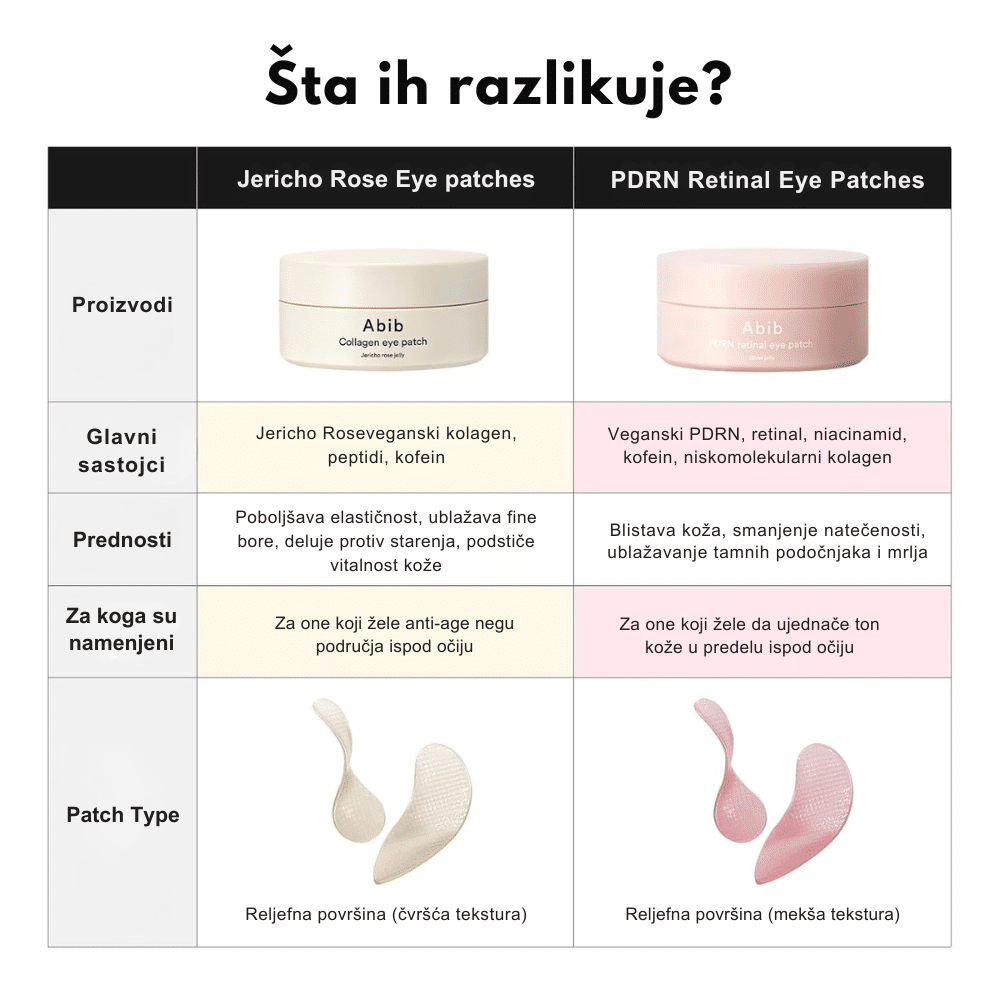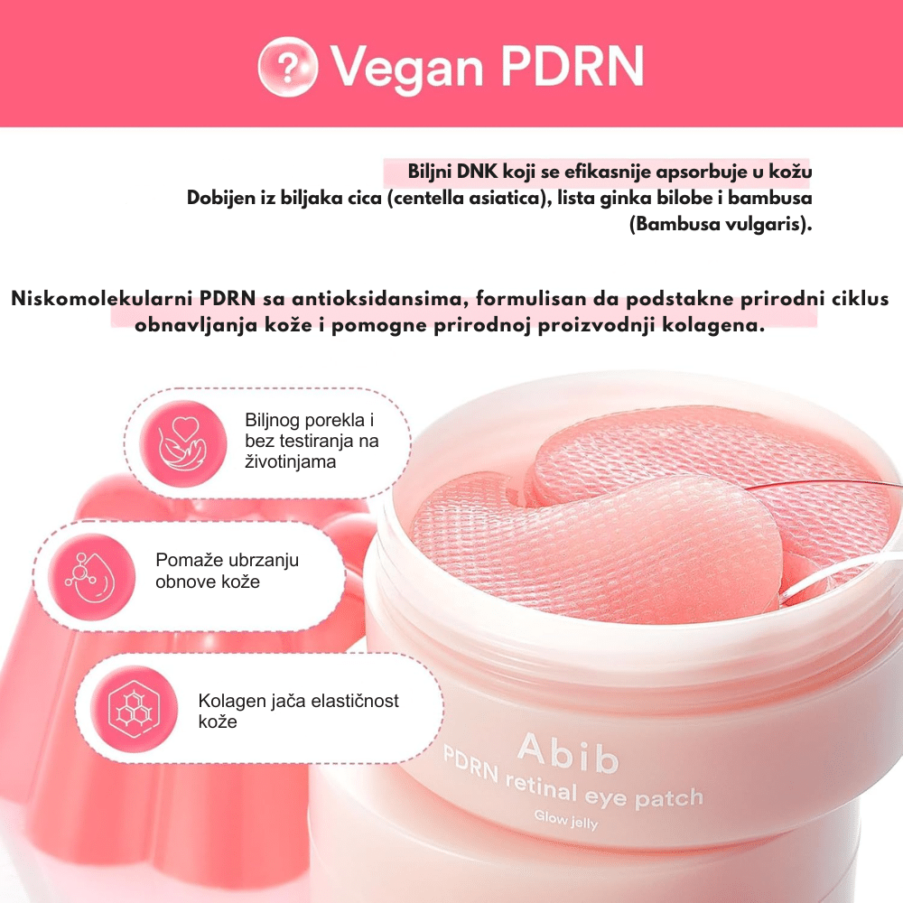 Abib PDRN Retinal Eye Patch Glow Jelly je luksuzni hidrogel tretman za područje ispod očiju, koji kombinuje nisko-molekularni PDRN, retinal (vitamin A), kolagen i kofein za ciljanu negu – smanjuje oticanje, ublažava tamne podočnjake i vidljivo zateže konturu oka za odmorniji i blistaviji izgled.