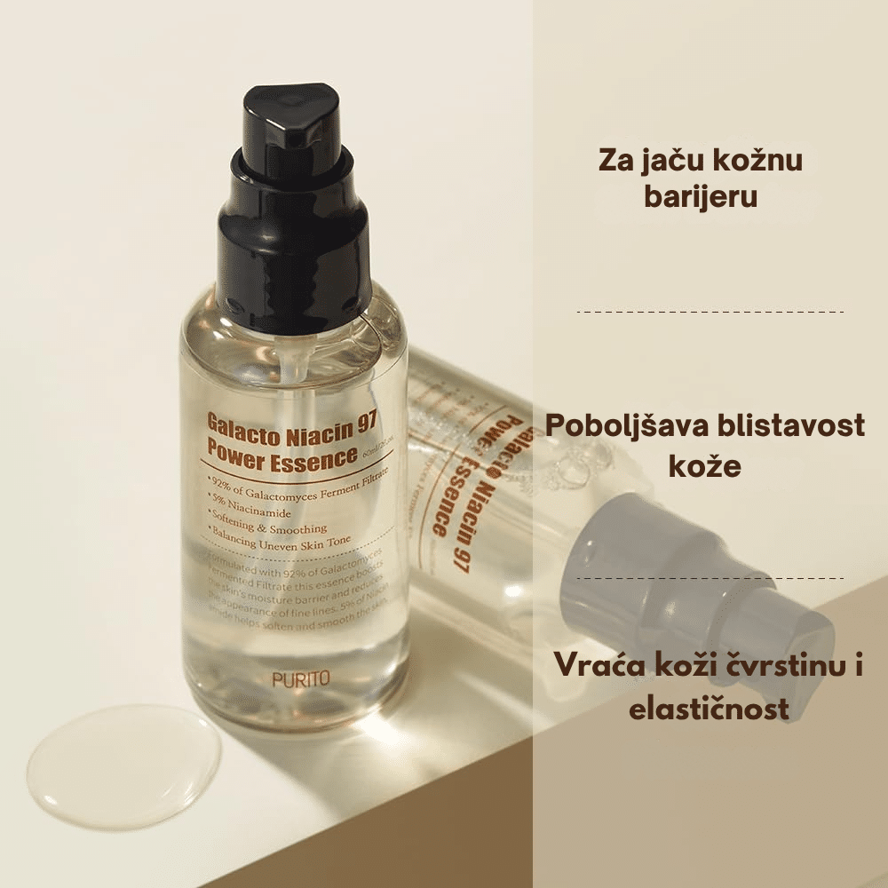 Purito Seoul Galacto Niacin 97 Power Essence je visokoefikasna esencija koja kombinuje 97% galactomyces ferment filtrata i niacinamid kako bi posvetlila, hidrirala i revitalizovala kožu. Ova lagana formula poboljšava teksturu kože, smanjuje pigmentacijske fleke i vraća prirodan sjaj tenu. Zahvaljujući probiotičkim sastojcima, jača barijeru kože i podržava njenu sposobnost regeneracije. Redovnom upotrebom koža postaje glatkija, ujednačenija i blistavija, bez iritacije.