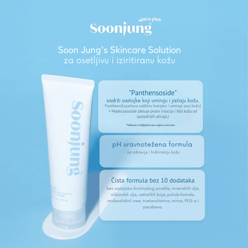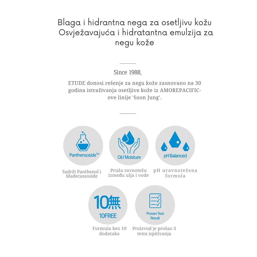 ETUDE SoonJung 10-Free Moist Emulsion 130ml je lagana, hipoalergena emulzija koja pruža dubinsku hidrataciju i umiruje osetljivu kožu. Formulisana sa 93% prirodno deriviranih sastojaka, uključujući pantenol, madecassoside i skvalan, ova emulzija jača kožnu barijeru, smanjuje crvenilo i poboljšava elastičnost kože. Bez mirisa, parabena i drugih potencijalno iritantnih sastojaka, pogodna je za sve tipove kože, uključujući i najosetljiviju.
