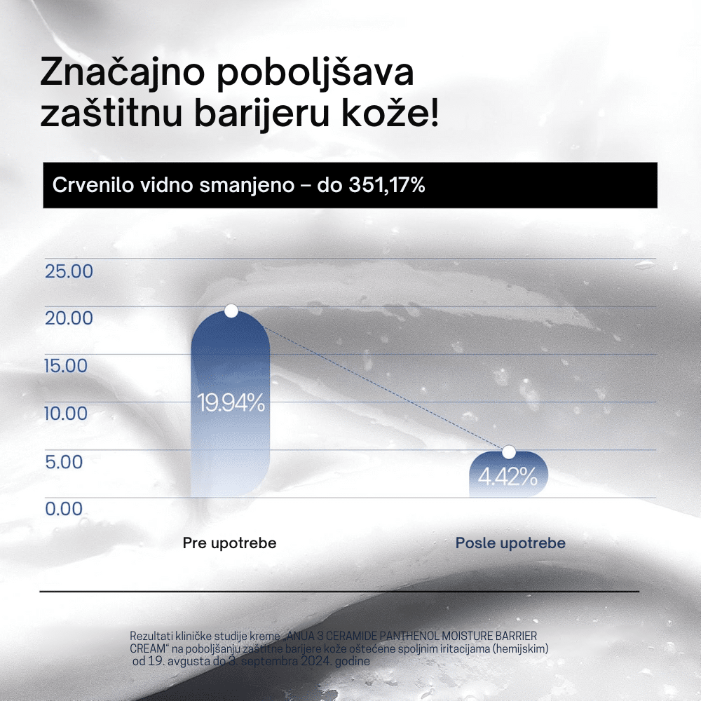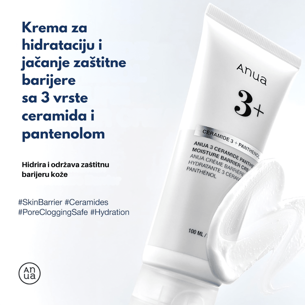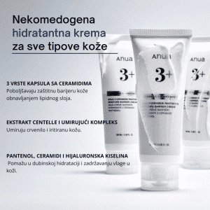 Anua 3 Ceramide Panthenol Moisture Barrier Cream je bogata, ali lako upijajuća krema sa tri različita ceramida (NP, AP, EOP), 5% panthenolom i hijaluronskom kiselinom. Dizajnirana je za dubinsku hidrataciju, jačanje barijere kože i smirivanje iritantne ili dehidrirane kože. Centella Asiatica ekstrakt dodatno umiruje crvenilo i poboljšava teksturu kože. Formula je nežna, nekomedogena, bez masnog završnog osećaja i pogodna za svakodnevno korišćenje kod svih tipova kože, uključujući osetljivu i masnu