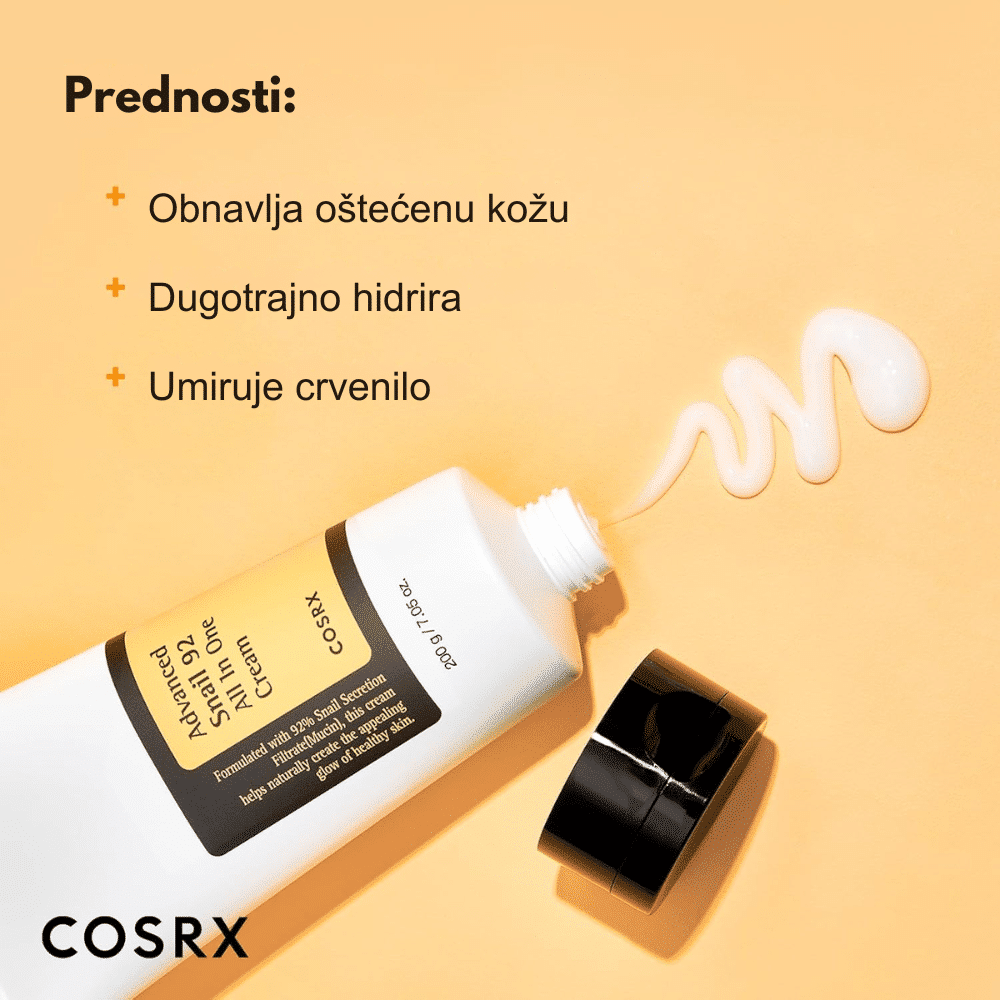 COSRX Advanced Snail 92 All In One Cream Tube 50g je višenamenska hidratantna krema obogaćena sa 92% filtrata puževe sluzi, namenjena za intenzivnu negu i regeneraciju kože. Ova bogata gel-krema pruža dubinsku hidrataciju, umiruje iritacije i pomaže u obnavljanju oštećene kože, čineći je glatkom i blistavom. Idealna je za sve tipove kože, uključujući osetljivu i sklonu aknama. Pomaže u obnavljanju oštećene kože i smanjenju vidljivosti ožiljaka. Brzo se upija bez osećaja lepljivosti, pogodna za sve tipove kože.