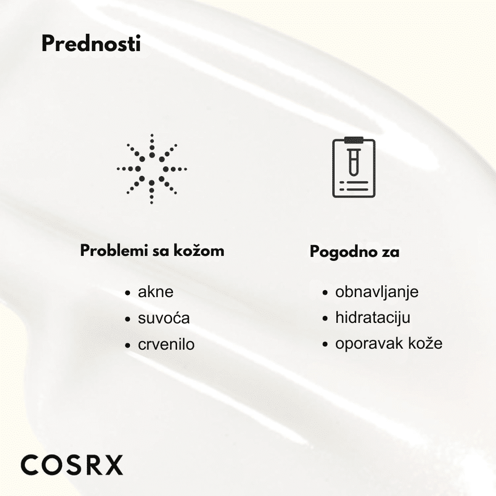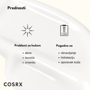 Cosrx je korejski kozmetički brend poznat po svojoj efikasnosti i jednostavnim, ali visokokvalitetnim proizvodima za negu kože. Osnovan 2013. godine, Cosrx je postao popularan zahvaljujući svojoj posvećenosti stvaranju proizvoda koji koriste minimalan broj sastojaka, ali sa maksimalnim učinkom, što ih čini idealnim za osetljivu kožu. Brend nudi širok spektar proizvoda, uključujući serume, tonere, maske i kreme, sa naglaskom na upotrebi sastojaka kao što su AHA, BHA, niacinamid, propolis i drugi biljni ekstrakti. Njihovi proizvodi su veganski, cruelty-free i ne sadrže parabene, sulfate ili veštačke mirise. Cosrx je prepoznat po svojoj jednostavnoj, ali efikasnoj formuli koja pomaže u rešavanju problema sa kožom kao što su akne, suvoća i nepravilnosti. Takođe, brend se ističe svojom posvećenostšću naučnoj i dermatološkoj istraživačkoj osnovi.