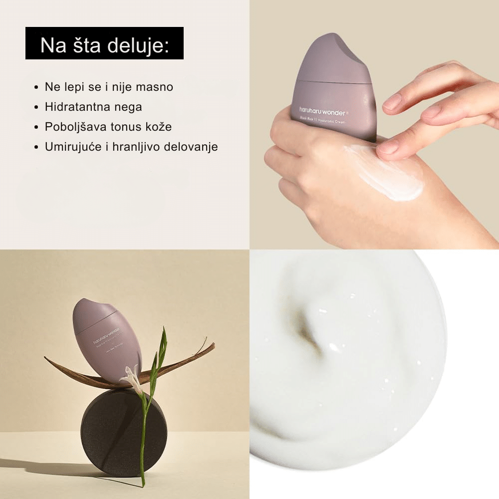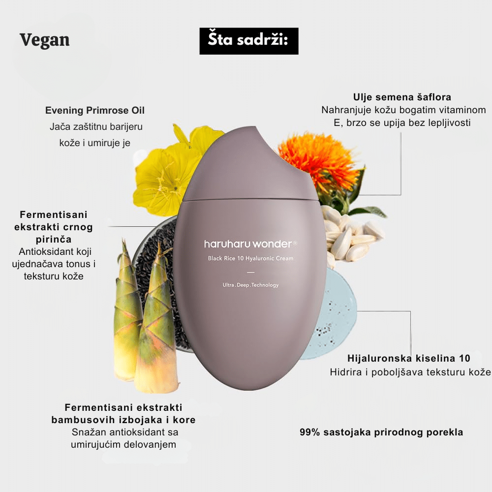 Haruharu WONDER Black Rice 10 Hyaluronic Cream je bogata hidratantna krema koja kombinuje fermentisani ekstrakt crnog pirinča i hijaluronski kompleks za intenzivnu negu kože. Pomaže u jačanju barijere, poboljšanju elastičnosti i dugotrajnoj hidrataciji, ostavljajući kožu glatkom i nahranjenom.