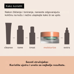 Naneti odgovarajuću količinu kreme na čistu kožu lica kao završni korak nege. Koristiti ujutru i uveče.