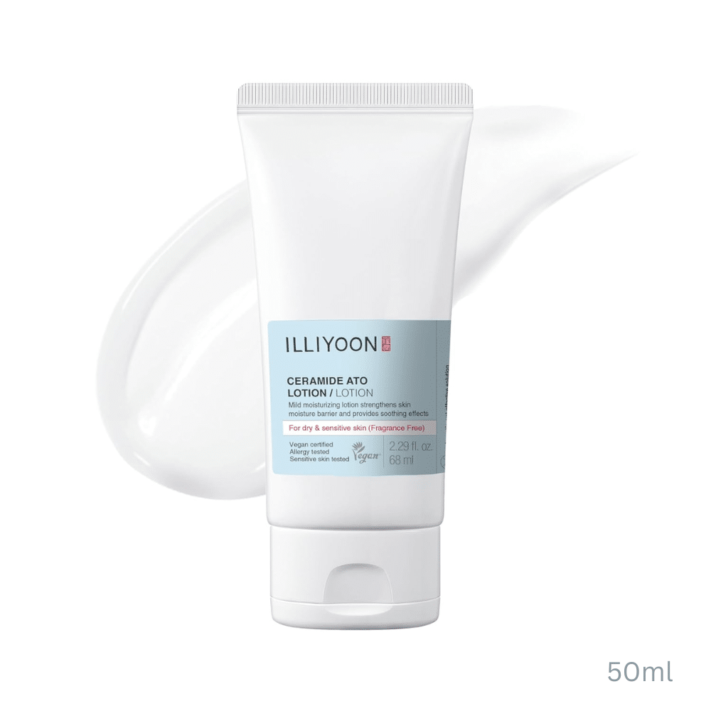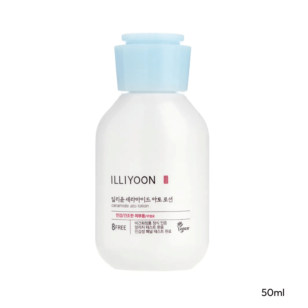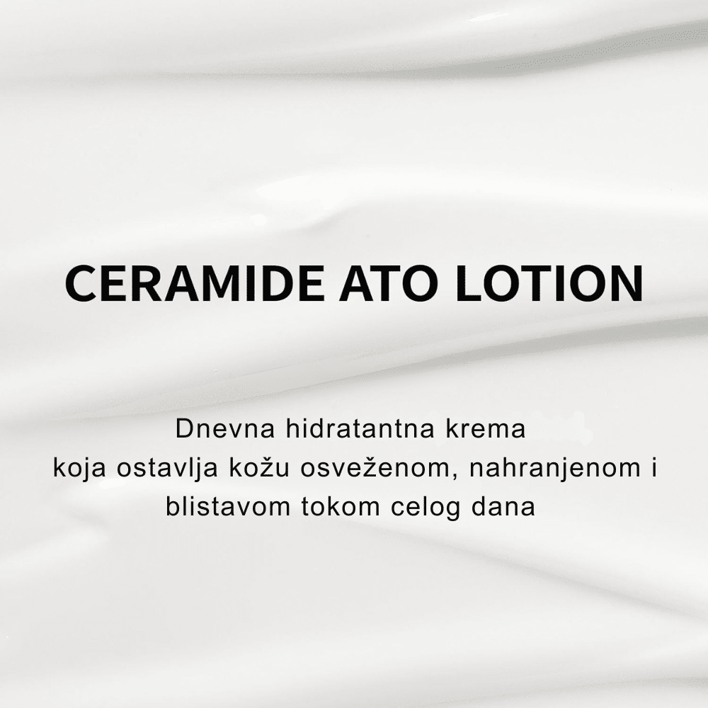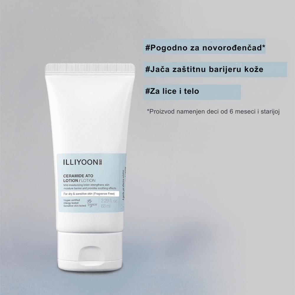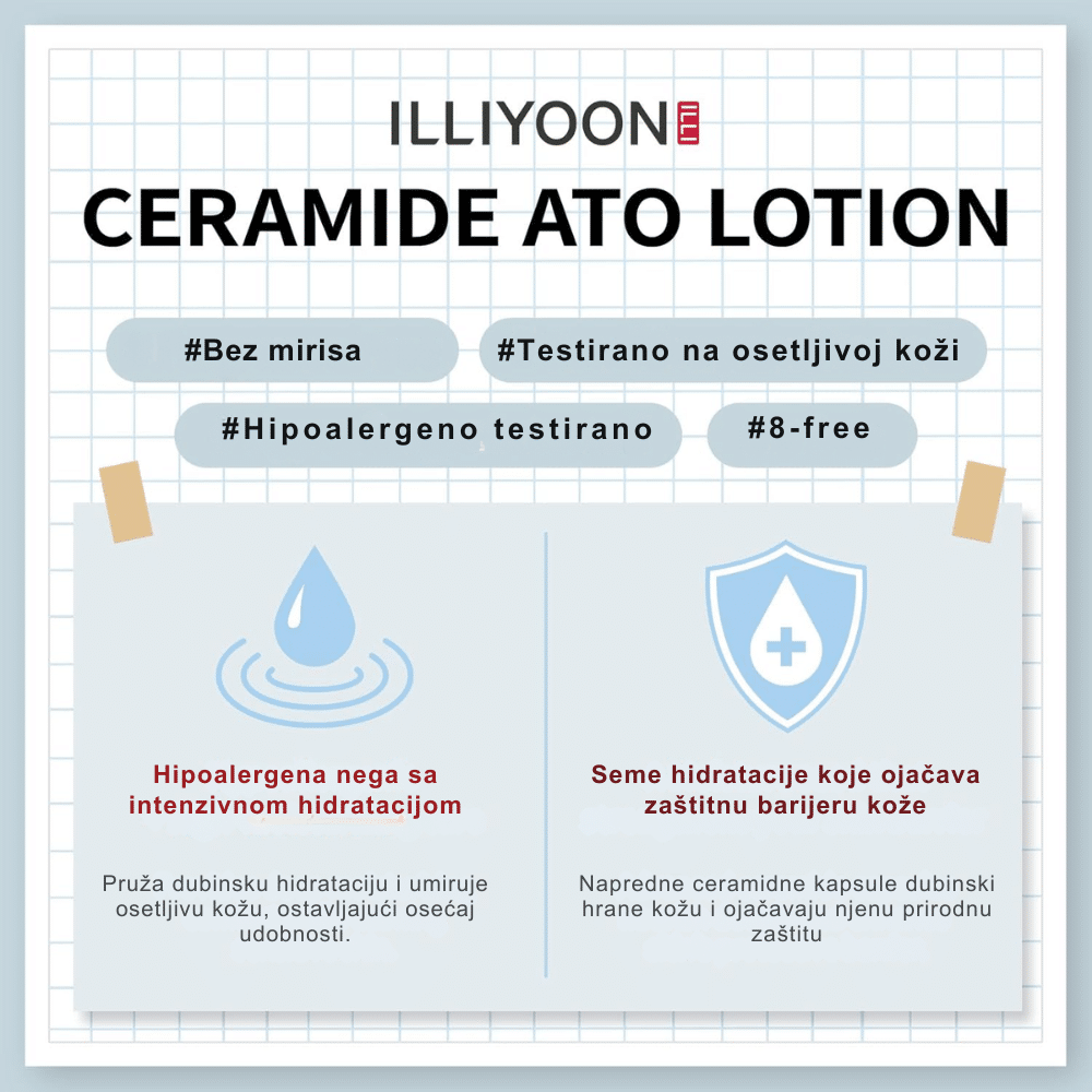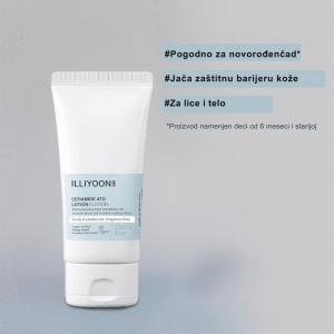ILLIYOON Ceramide Ato Lotion Mini 50 ml je lagani losion za lice i telo sa ceramidima, šea puterom i ginseng vodom koji intenzivno hidrira, obnavlja i jača barijeru kože, idealan za svakodnevnu negu i osetljivu kožu.