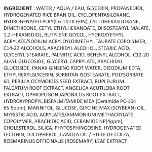 Water (Aqua), Glycerin, Propanediol, Butyrospermum Parkii (Shea) Butter, Cyclopentasiloxane, Hydrogenated Poly(C6-14 Olefin), Cyclohexasiloxane, Dimethicone, Cetyl Ethylhexanoate, Diisostearyl Malate, Hydroxyethyl Acrylate/Sodium Acryloyldimethyl Taurate Copolymer, C14-22 Alcohols, Arachidyl Alcohol, Stearic Acid, Glyceryl Stearate, Palmitic Acid, Behenyl Alcohol, Glyceryl Caprylate, Butylene Glycol, C12-20 Alkyl Glucoside, Panax Ginseng Root Water, Arachidyl Glucoside, Disodium EDTA, Ethylhexylglycerin, Sorbitan Isostearate, Polysorbate 60, Bupleurum Falcatum Root Extract, Angelica Acutiloba Root Extract, Ophiopogon Japonicus Root Extract, Myristic Acid, Hydroxypropyl Bispalmitamide MEA (Ceramide PC-104 32.7 ppm), Mannitol, Lauric Acid, Acrylates/Ammonium Methacrylate Copolymer, Perilla Ocymoides Seed Extract, Cholesterol, Silica, Tocopherol.