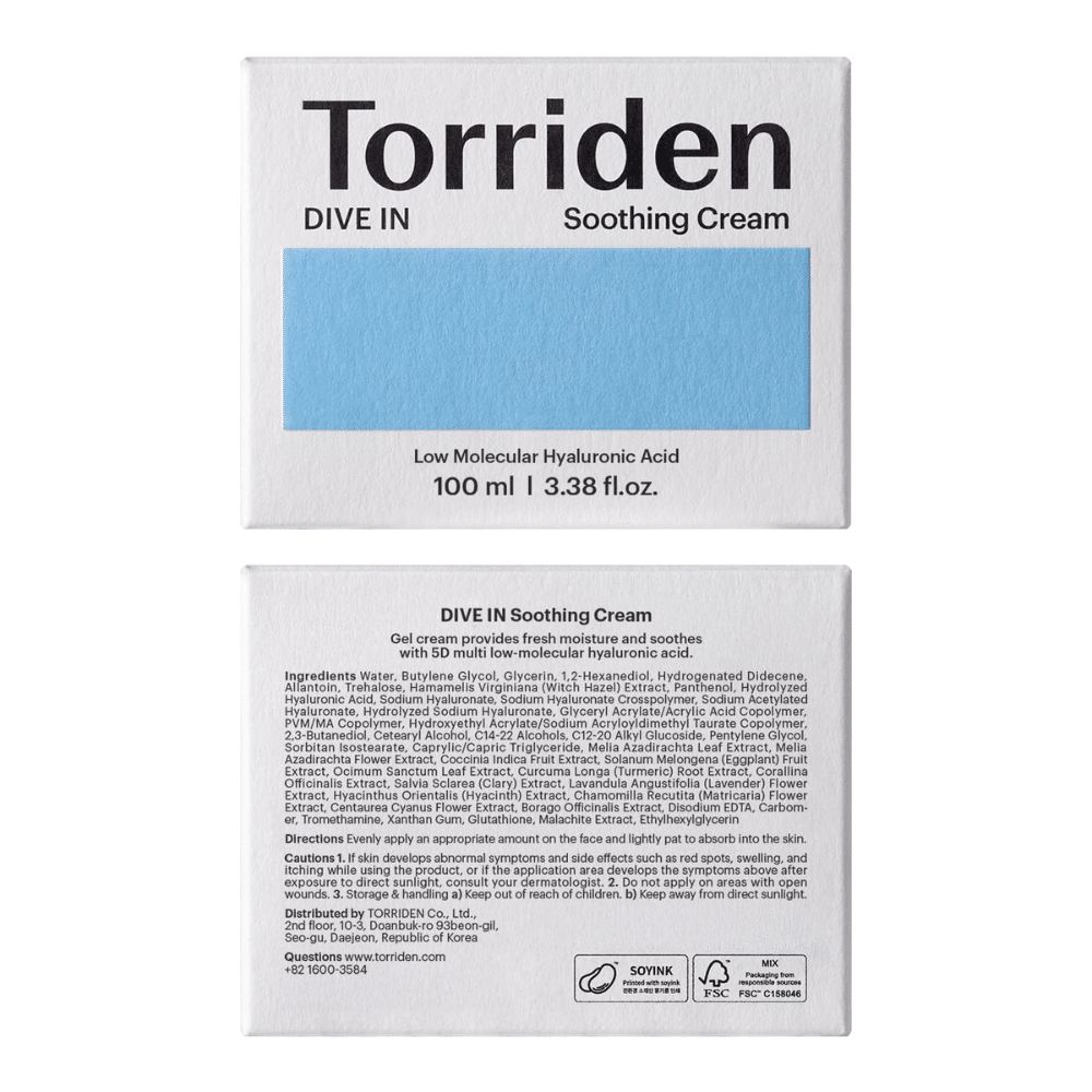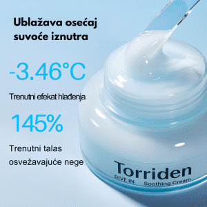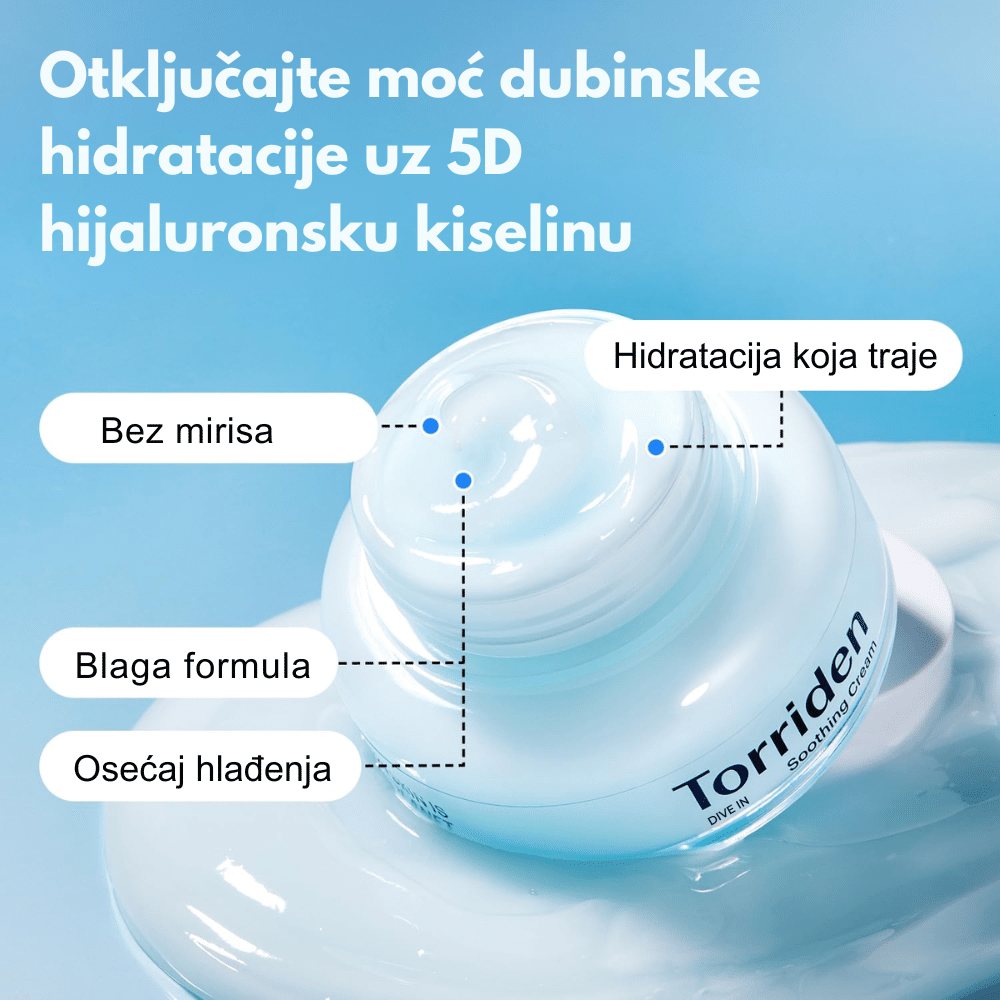 Torriden DIVE IN Soothing Cream je gel-krema formulacija sa kompleksom od više molekularnih težina hijaluronske kiseline („5D Complex”), pantenolom i alantoinom, koja intenzivno hidrira, umiruje osetljivu ili iritiranu kožu i jača njenu barijeru bez osećaja težine.