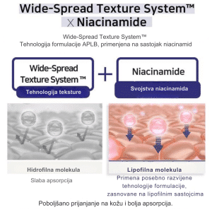 Niacinamide (nikotinamid) je oblik vitamina B3, poznat po svojoj svestranosti i blagom, ali efikasnom dejstvu na kožu. Pomaže u regulisanju proizvodnje sebuma, što ga čini odličnim za masnu i kombinovanu kožu, jer smanjuje višak masnoće i doprinosi matiranom izgledu tena. Osim toga, umiruje kožu i smanjuje crvenilo i iritacije, zbog čega je koristan i za osetljivu i problematičnu kožu sklonu aknama. Jedna od njegovih najpoznatijih prednosti je sposobnost ujednačavanja tena i smanjenja tamnih mrlja i hiperpigmentacija, čineći kožu svetlijom i zdravijom. Takođe, niacinamide jača zaštitnu barijeru kože, poboljšava hidrataciju i pomaže u sprečavanju gubitka vlage, što ga čini pogodnim i za suve tipove kože. Zahvaljujući svojim antioksidativnim svojstvima, štiti kožu od spoljašnjih agresora poput zagađenja i UV zračenja, pomažući u sprečavanju preranog starenja. Zbog svoje blage i neiritirajuće formule, niacinamide je pogodan za sve tipove kože i često se koristi u serumima, kremama i tonicima kao ključni sastojak za zdrav i uravnotežen ten.