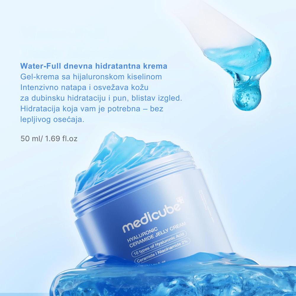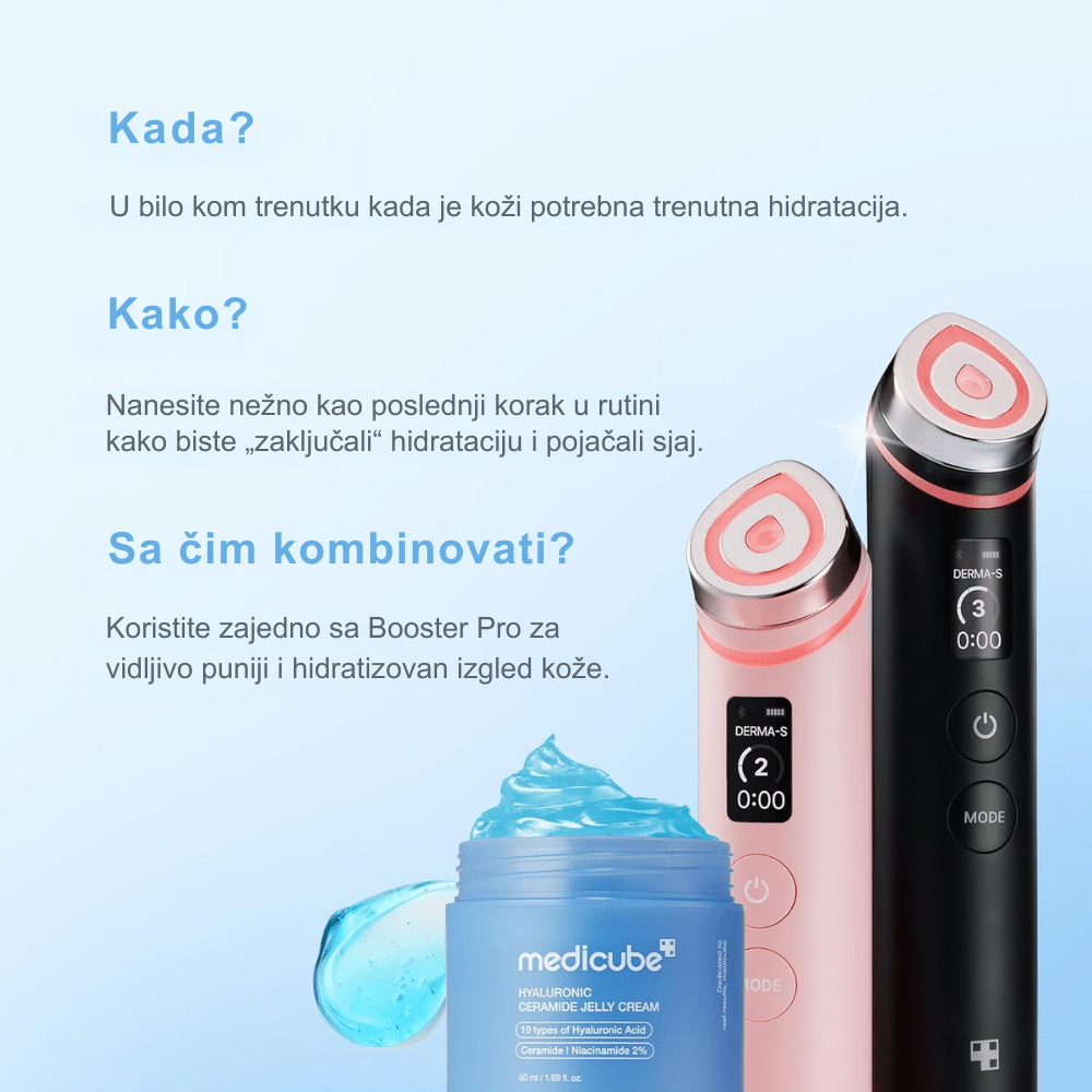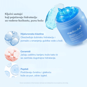 Medicube Hyaluronic Ceramide Jelly Cream je inovativni hidratantni tretman specifične teksture koja podseća na prozračni žele, dizajniran da pruži maksimalnu vlažnost bez osećaja težine. Ova krema koristi sinergiju hijaluronske kiseline i ceramida kako bi kreirala nevidljivi rezervoar vlage na površini kože, istovremeno “zaključavajući” hranljive materije unutar barijere. Njena jedinstvena formulacija omogućava koži da postane trenutno jedra i osvežena, što je čini savršenim rešenjem za dehidrirano lice koje pati od gubitka volumena i sitnih linija uzrokovanih suvoćom. Ono što ovaj proizvod izdvaja je njegova sposobnost da umiri iritacije i ojača odbrambeni mehanizam kože, ostavljajući završetak koji nije mastan, već blistav i “staklast” (glass skin efekat). Žele tekstura se u dodiru sa toplotom kože transformiše u vodenastu esenciju koja prodire duboko u pore, pružajući dugotrajni komfor tokom celog dana. Idealna je kao podloga za šminku jer zaglađuje površinu lica, dok njeni aktivni sastojci rade na dugoročnoj elastičnosti i čvrstini, čineći kožu otpornom na spoljne agresore i isušivanje.