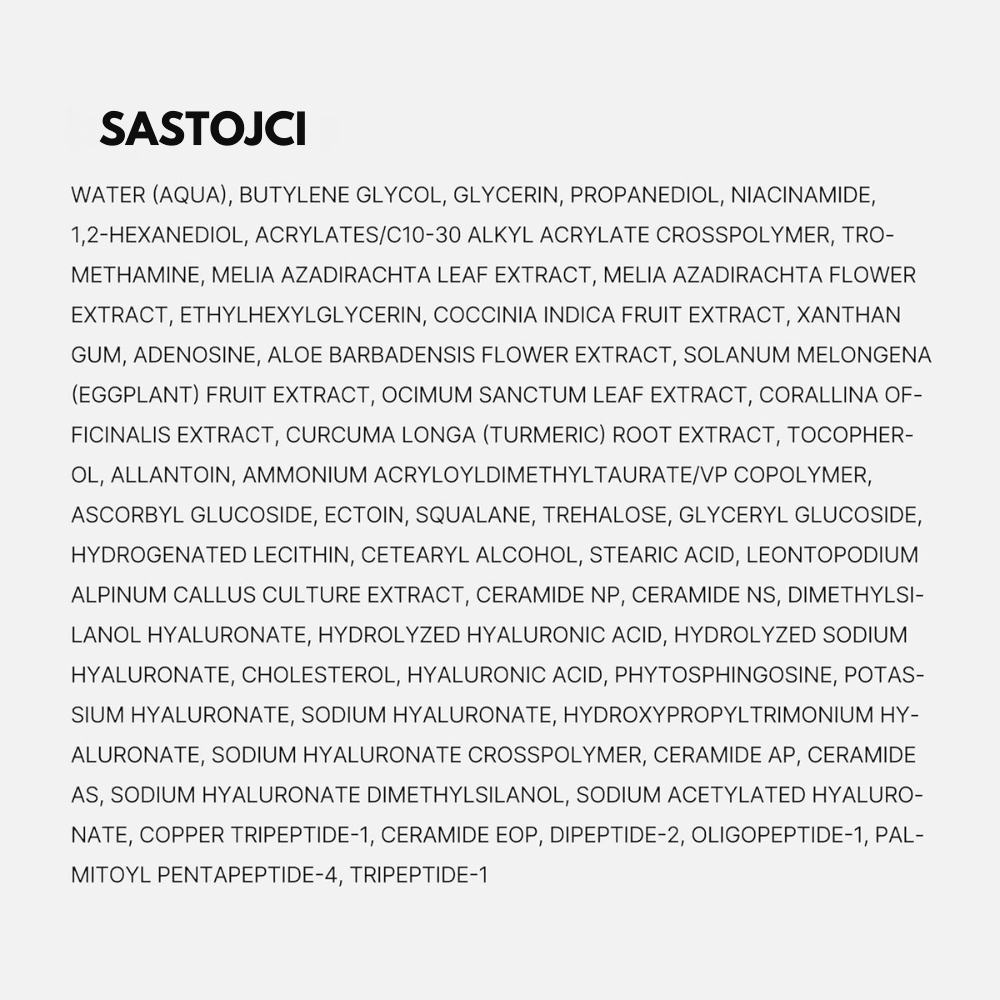 Water, Glycerin, Methylpropanediol, 1,2-Hexanediol, Niacinamide, Sodium Hyaluronate, Hyaluronic Acid, Ceramide NP, Ceramide AP, Ceramide AS, Ceramide EOP, Ceramide NS, Hydrolyzed Hyaluronic Acid, Cholesterol, Phytosphingosine, Allantoin, Panthenol, Adenosine, Ethylhexylglycerin, Hydrogenated Lecithin, Butylene Glycol, Caprylic/Capric Triglyceride, Carbomer, Arginine, Xanthan Gum, Disodium EDTA.