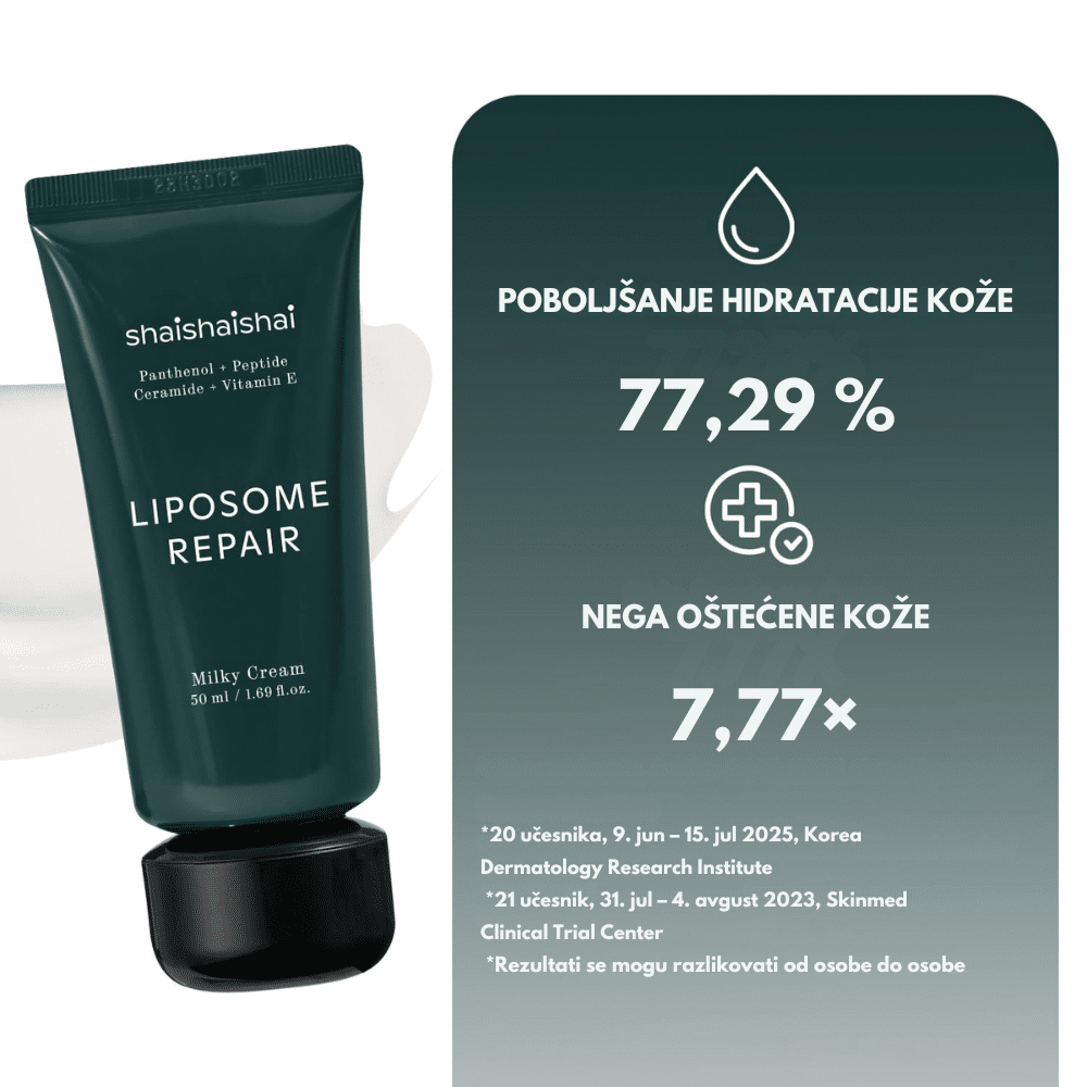 SHAISHAISHAI Liposome Repair Milky Cream je hranljiva mlečna krema koja obnavlja kožnu barijeru, pruža dugotrajnu hidrataciju i poboljšava elastičnost kože.