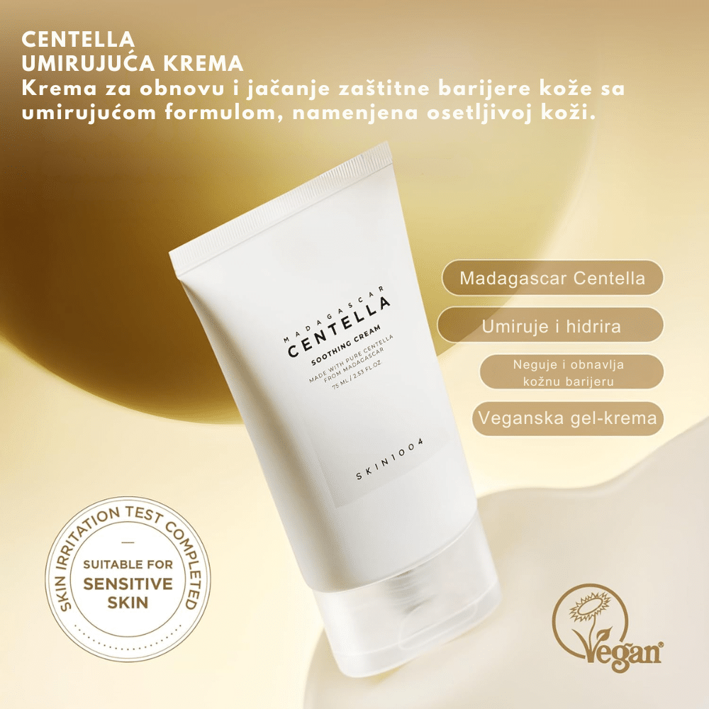 SKIN1004 Madagascar Centella Soothing Cream je lagana, nemasna gel-krema formulisana sa 72% ekstrakta Centella Asiatica iz netaknute prirode Madagaskara. Ova krema pruža intenzivnu hidrataciju i umirujuću negu za osetljivu i iritiranu kožu.