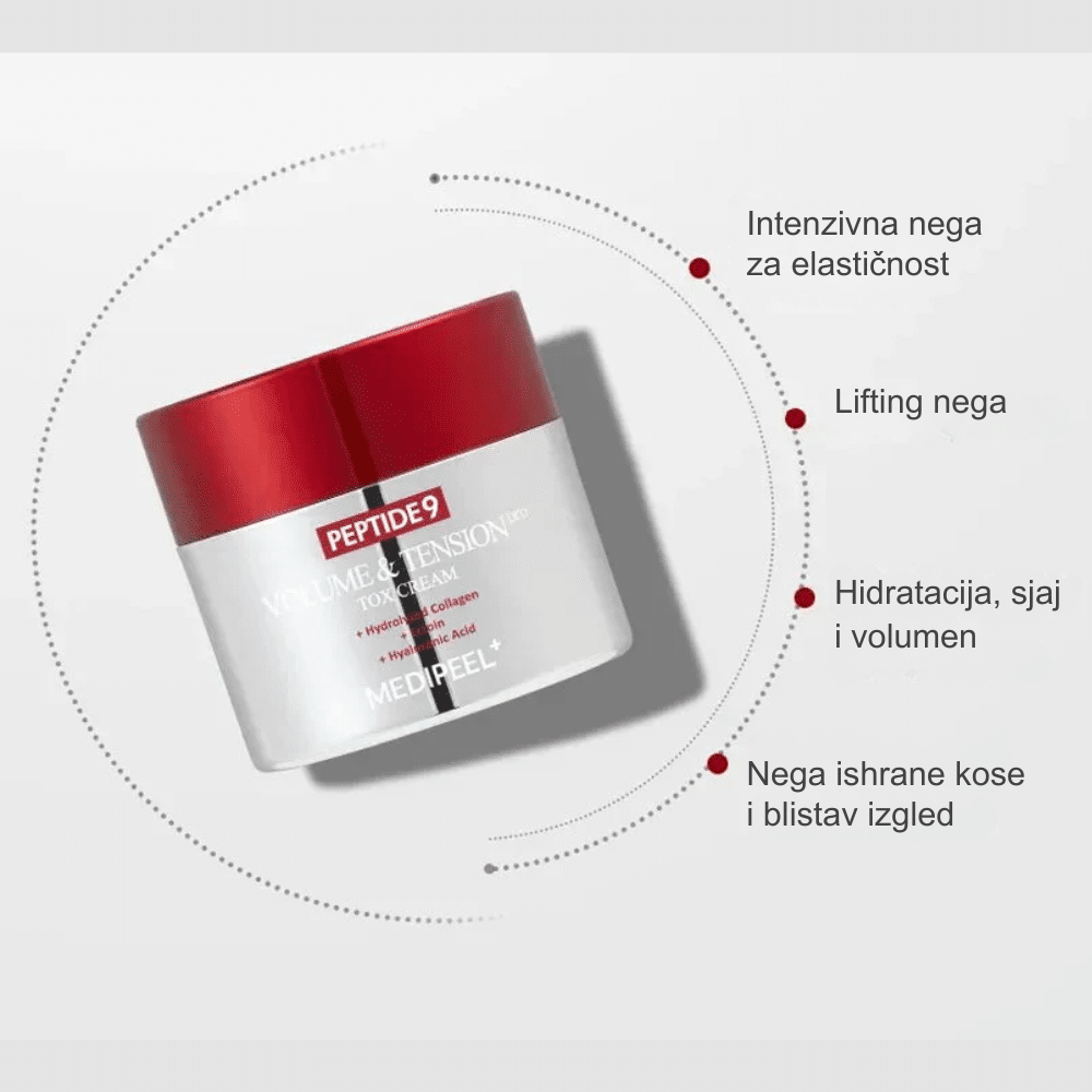 MEDIPEEL Peptide 9 Volume And Tension Tox Cream Pro je najsavremenija, profesionalna krema dizajnirana da reši dva ključna problema zrele kože: gubitak volumena i opuštanje tonusa (tension). Ova “Pro” verzija donosi pojačanu koncentraciju od 9 vrsta peptida koji stimulišu ćelije na proizvodnju kolagena, dok patentirani francuski sastojak Volufiline deluje kao prirodni filer, popunjavajući upale obraze i nazolabijalne bore. Specifičnost ove kreme je njena “Tension” tehnologija koja stvara nevidljivu mrežu na površini kože, pružajući trenutni osećaj zategnutosti i liftinga. Formulacija je obogaćena ekstraktom kavijara i ekstraktom matičnih ćelija biljaka, koji zajedno sa hijaluronskom kiselinom prodiru duboko u epidermis kako bi obnovili vlažnost i elastičnost. Zahvaljujući dodatku astaksantina, koža dobija moćnu antioksidativnu zaštitu od fotostarenja. Tekstura kreme je bogata i hranljiva, ali razvijena tako da se topi u dodiru sa toplotom kože, ostavljajući lice baršunastim, čvršćim i vidno redefinisanim, sa prepoznatljivim “staklenim” sjajem koji odlikuje zdravu i negovanu kožu.