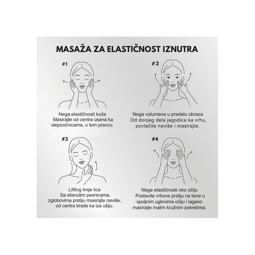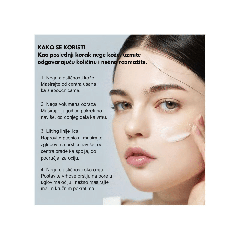 Kremu koristite kao poslednji korak u jutarnjoj i večernjoj rutini nege (nakon čišćenja, tonera i seruma). Uzmite odgovarajuću količinu i nanesite je na lice, vrat i dekolte. Nežno umasirajte kremu kružnim pokretima usmerenim na gore, od brade ka slepoočnicama, kako biste potpomogli lifting efekat. Na regije sa izraženijim borama (nazolabijalne brazde ili čelo) nanesite tanak dodatni sloj i blago utapkajte. Zbog svoje “tension” formule, krema je idealna podloga za šminku jer vizuelno zaglađuje reljef kože i sprečava nakupljanje pudera u finim linijama.