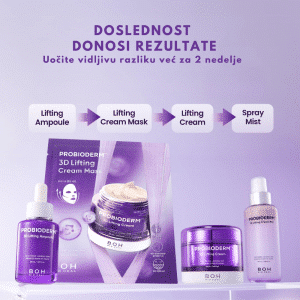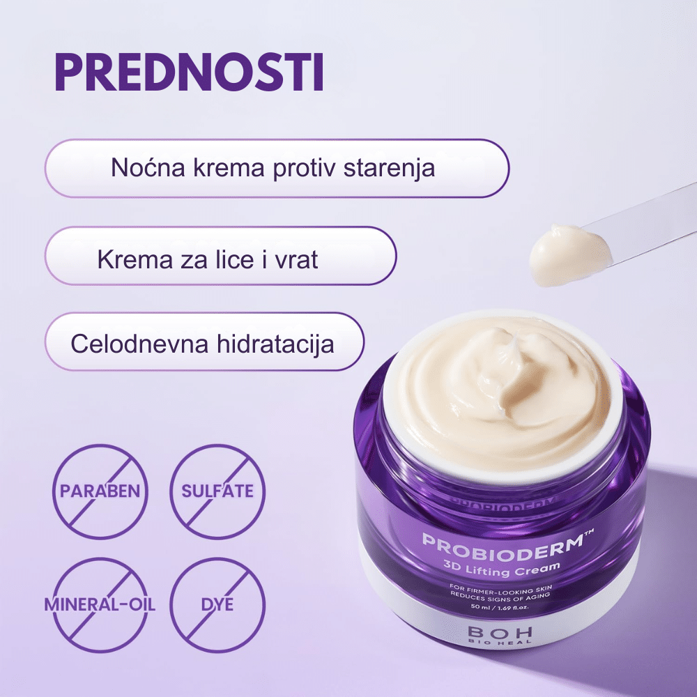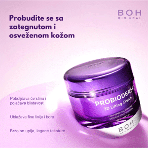 BIOHEAL BOH Probioderm 3D Lifting Cream je čvrsta, bogata anti-age krema dizajnirana da podigne, zategne i poboljša elastičnost kože uz pomoć probiotika i peptida. Formula jača kožnu barijeru, smanjuje vidljivost bora i pruža efekat trenutne punoće, dok dubinski hidratantni kompleks obnavlja mekoću i glatkoću kože. Krema pruža 3D lifting osećaj uz dugotrajnu hidrataciju i intenzivnu regeneraciju — idealna za kožu kojoj je potrebna čvrstoća i podmlađen izgled.