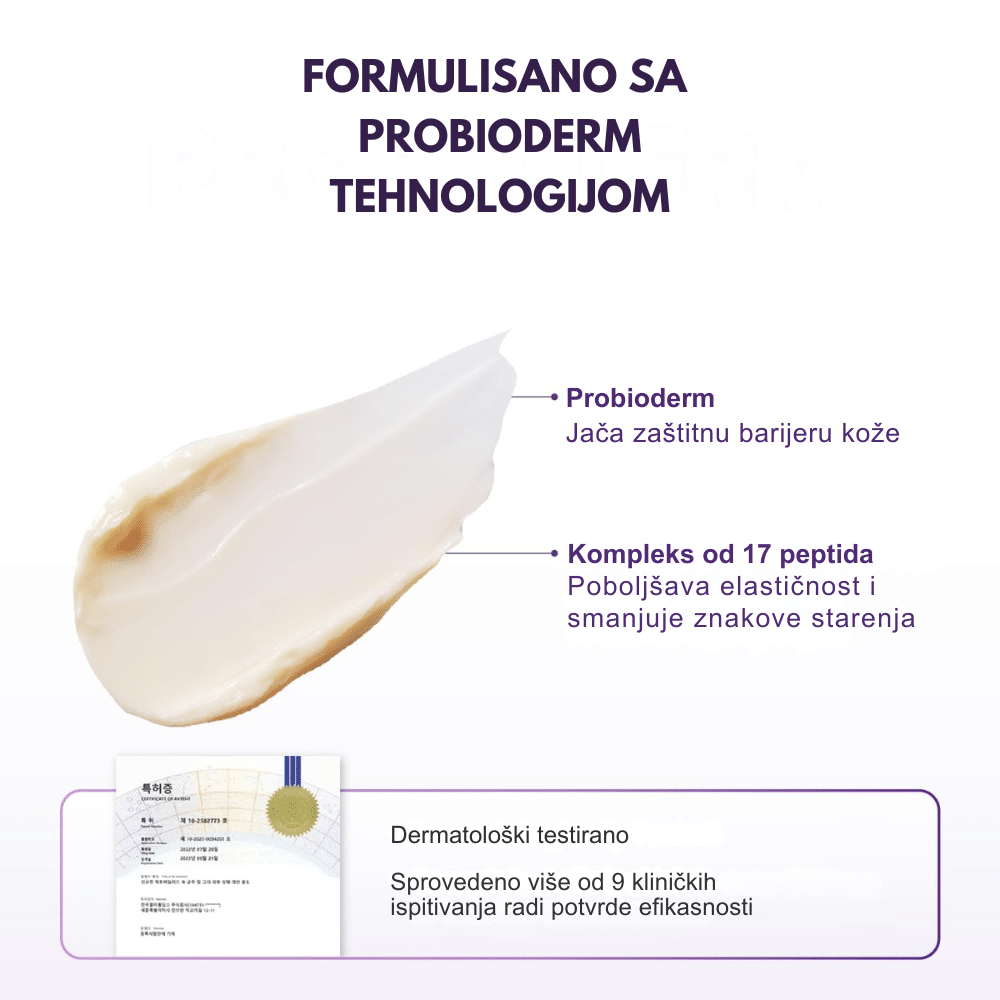 Krema sa probioticima i peptidima koja pruža 3D lifting efekat, jača barijeru i zaglađuje bore.