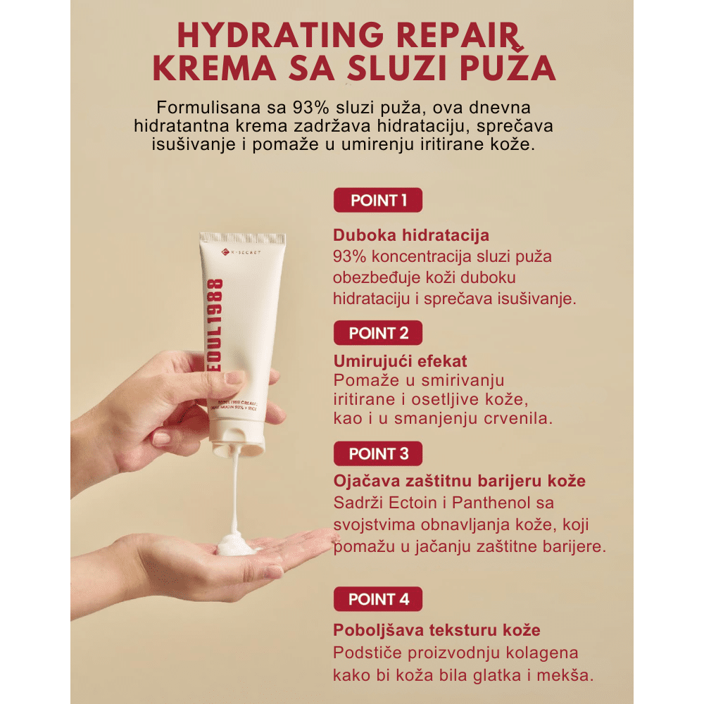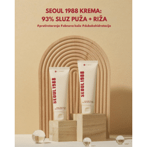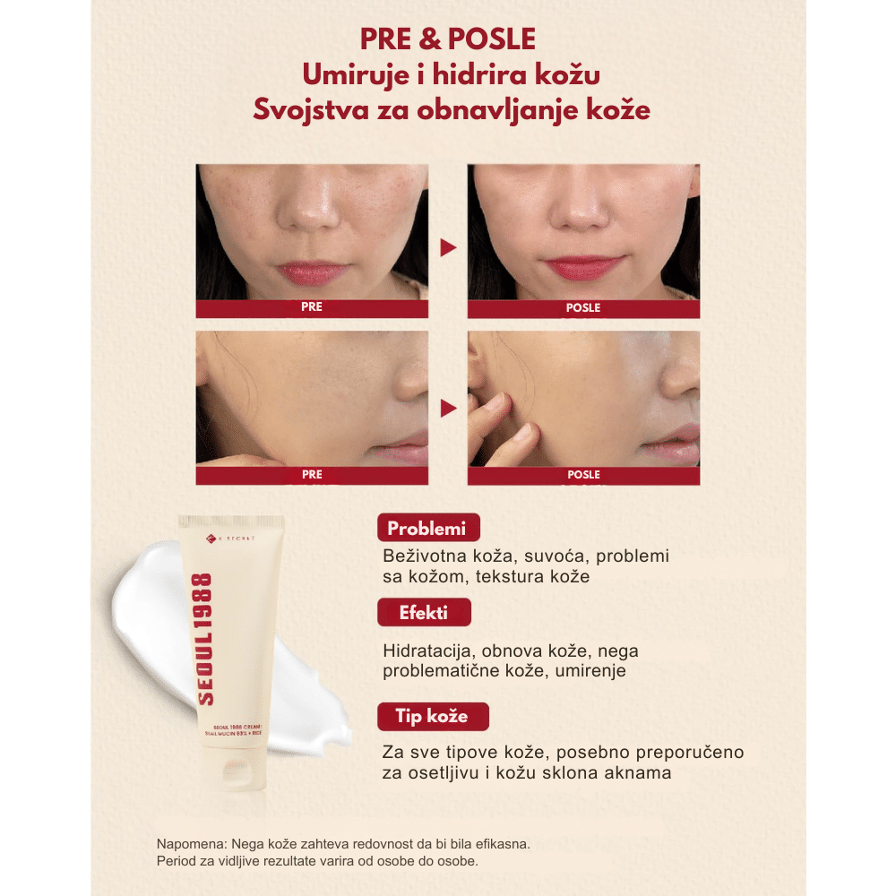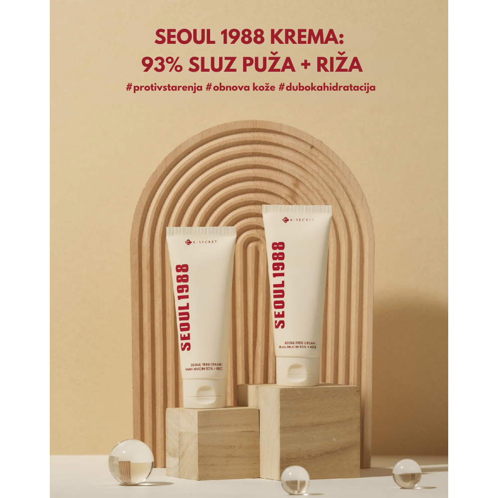 KSECRET SEOUL 1988 Cream je bogata, obnavljajuća krema sa 93% snail mucin filtrata i pirinčanim ekstraktom, dizajnirana da dubinski hidrira, regeneriše i posvetli kožu. Snail mucin obnavlja oštećenja, umiruje iritacije i poboljšava elastičnost, dok pirinčani ekstrakt ujednačava ten i povećava prirodan sjaj kože. Kremasta, svilenkasta tekstura lako klizi po koži, ostavljajući je glatkom, punijom i svežom.