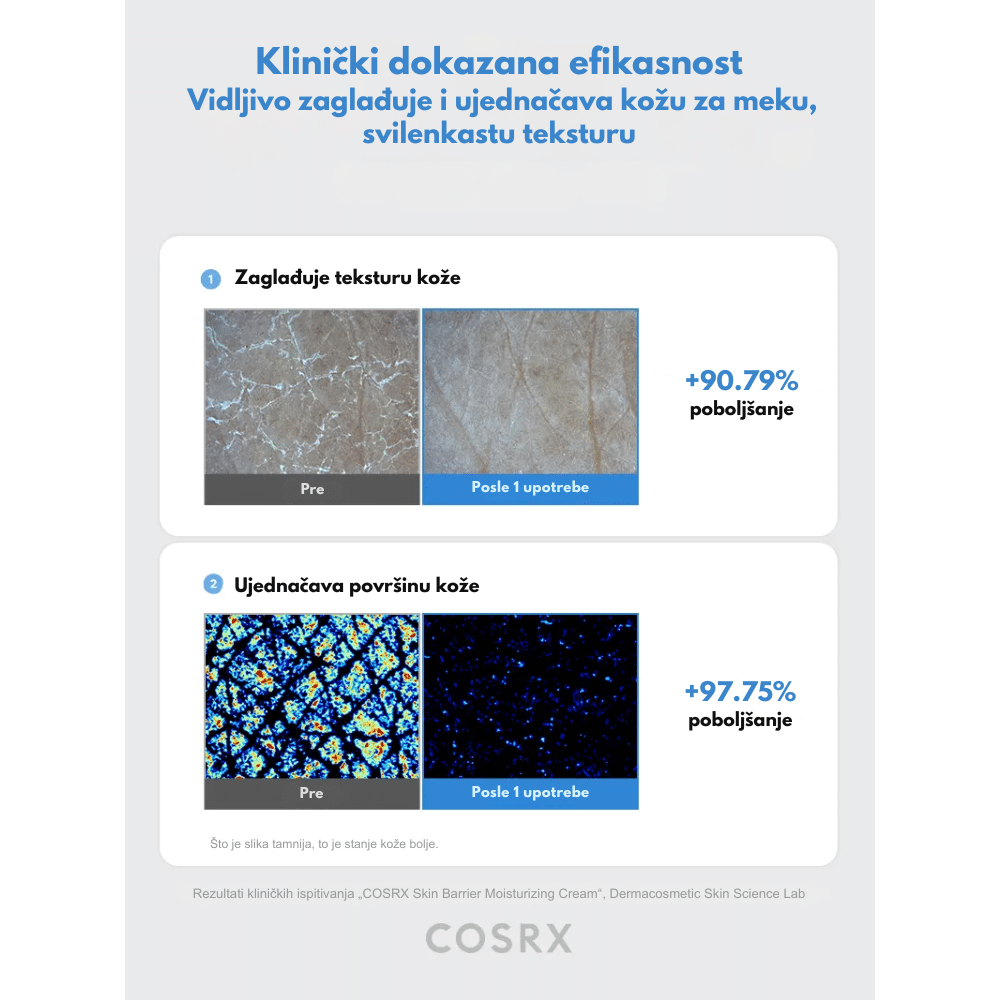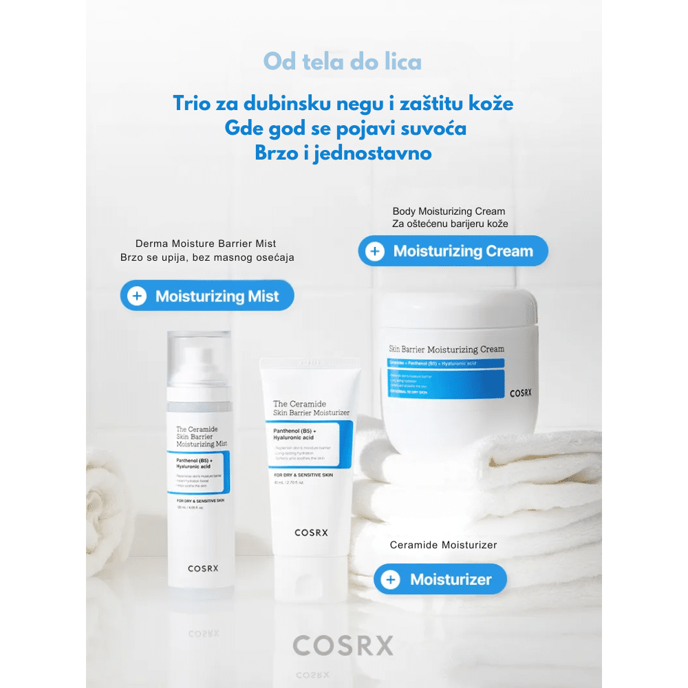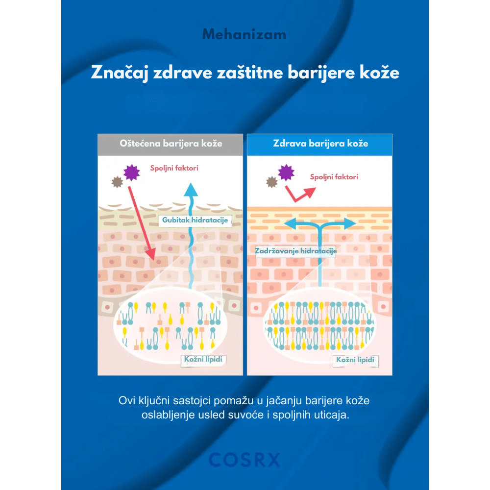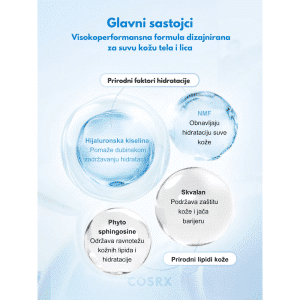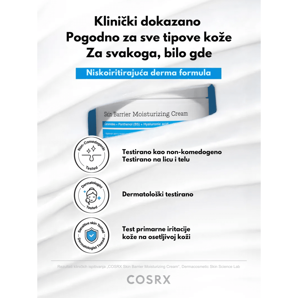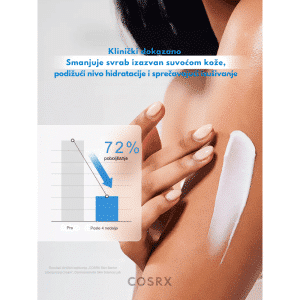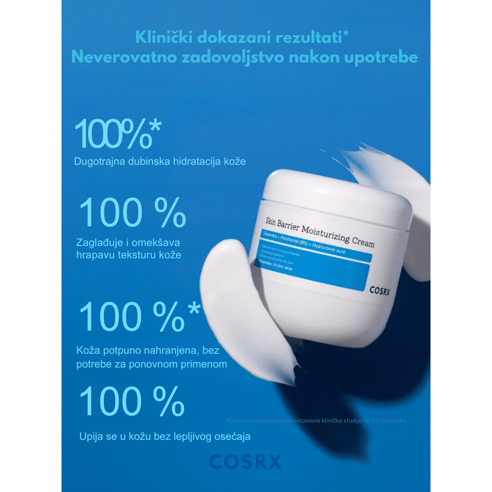 COSRX Skin Barrier Moisturizing Cream pruža intenzivnu i dugotrajnu hidrataciju do 100 sati, dok simultano jača kožnu barijeru zahvaljujući kombinaciji ceramida, hijaluronske kiseline i hranljivih sastojaka. Lagana, ne-masna tekstura se brzo upija i omekšava hrapavu, suvu ili nadraženu kožu — pogodna je za lice i telo, posebno kada je koža suva, osetljiva ili oštećena. Ovaj bogati, ali nežni krem stvara osjećaj udobnosti i zaštite, vraćajući koži elastičnost, mekoću i osećaj glatkoće.