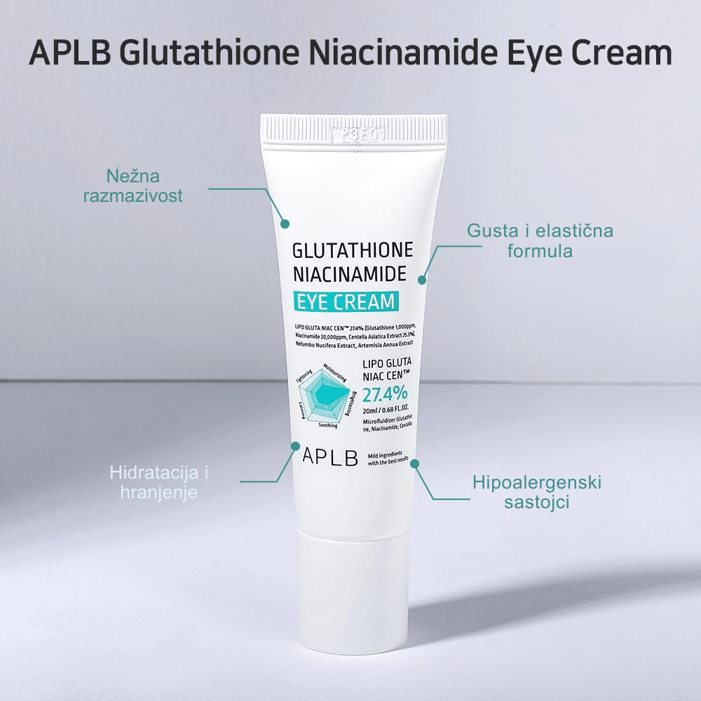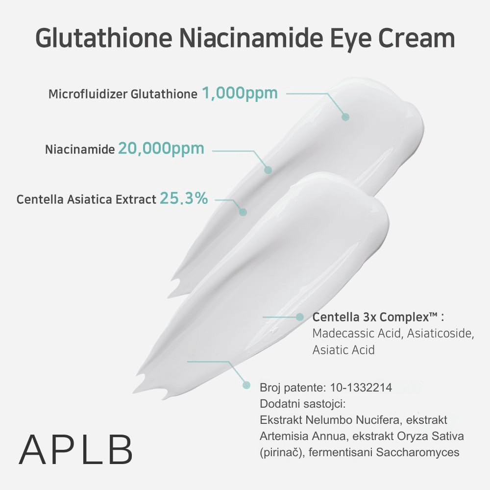 APLB Glutathione Niacinamide Eye Cream neguje osetljivu kožu oko očiju i doprinosi svetlijem izgledu.